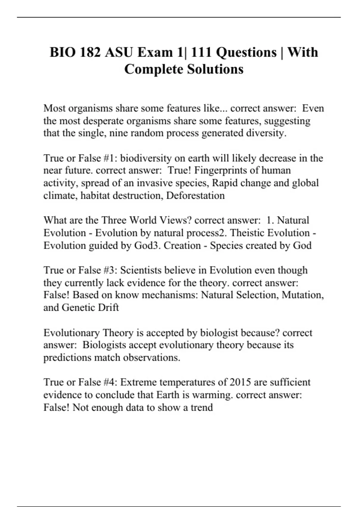 BIO 182 ASU Exam 1| 111 Questions | With Complete Solutions