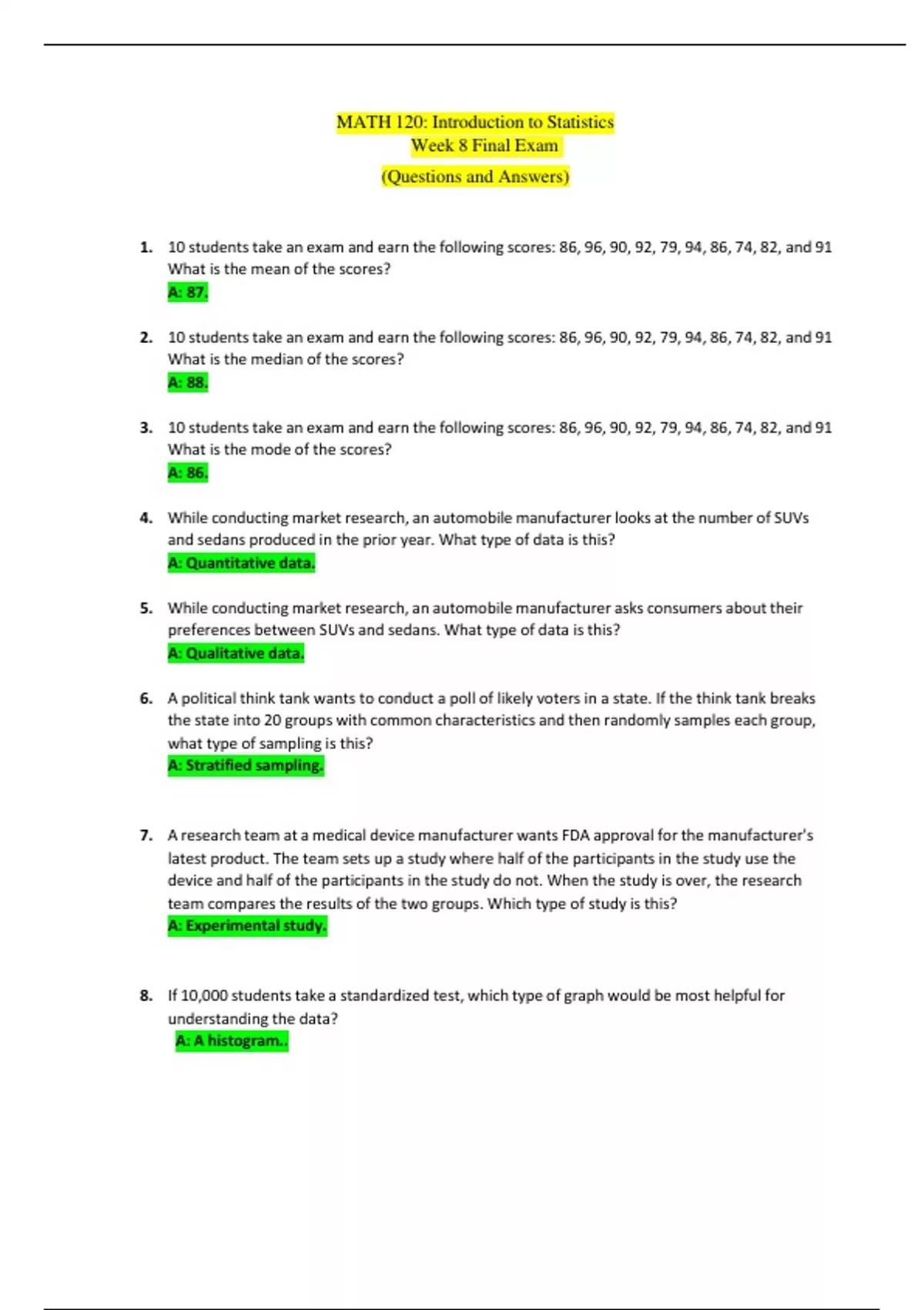 ***Download Test Bank Immediately After the Purchase. Just in case you have trouble downloading, kindly message me, and I will send it to you via Google Doc or email. Thank you*** MATH 120: Introduction to Statistics Week 8 Final Exam The MATH 120: Introduction to Statistics Week 8 Final Exam is a comprehensive assessment that tests students' understanding of statistical concepts. The exam covers a wide range of topics, including statistical graphs, data analysis, and computational techniques. The exam is typically taken by students towards the end of their course, providing an opportunity to demonstrate their grasp of the fundamental concepts taught throughout the semester. This exam includes various types of questions such as multiple-choice, short answer, and problem-solving questions, allowing students to showcase their understanding of different aspects of statistics. The exam comes with accurate answers, which can be a great tool for students to review and prepare for their final assessment. 1. 10 students take an exam and earn the following scores: 86, 96, 90, 92, 79, 94, 86, 74, 82, and 91 What is the mean of the scores? A: 87. 2. 10 students take an exam and earn the following scores: 86, 96, 90, 92, 79, 94, 86, 74, 82, and 91 What is the median of the scores? A: 88. 3. 10 students take an exam and earn the following scores: 86, 96, 90, 92, 79, 94, 86, 74, 82, and 91 What is the mode of the scores? A: 86. 4. While conducting market research, an automobile manufacturer looks at the number of SUVs and sedans produced in the prior year. What type of data is this? A: Quantitative data. 5. While conducting market research, an automobile manufacturer asks consumers about their preferences between SUVs and sedans. What type of data is this? A: Qualitative data. 6. A political think tank wants to conduct a poll of likely voters in a state. If the think tank breaks the state into 20 groups with common characteristics and then randomly samples each group, what type of sampling is this? A: Stratified sampling. 7. A research team at a medical device manufacturer wants FDA approval for the manufacturer's latest product. The team sets up a study where half of the participants in the study use the device and half of the participants in the study do not. When the study is over, the research team compares the results of the two groups. Which type of study is this? A: Experimental study. 8. If 10,000 students take a standardized test, which type of graph would be most helpful for understanding the data? A: A histogram..