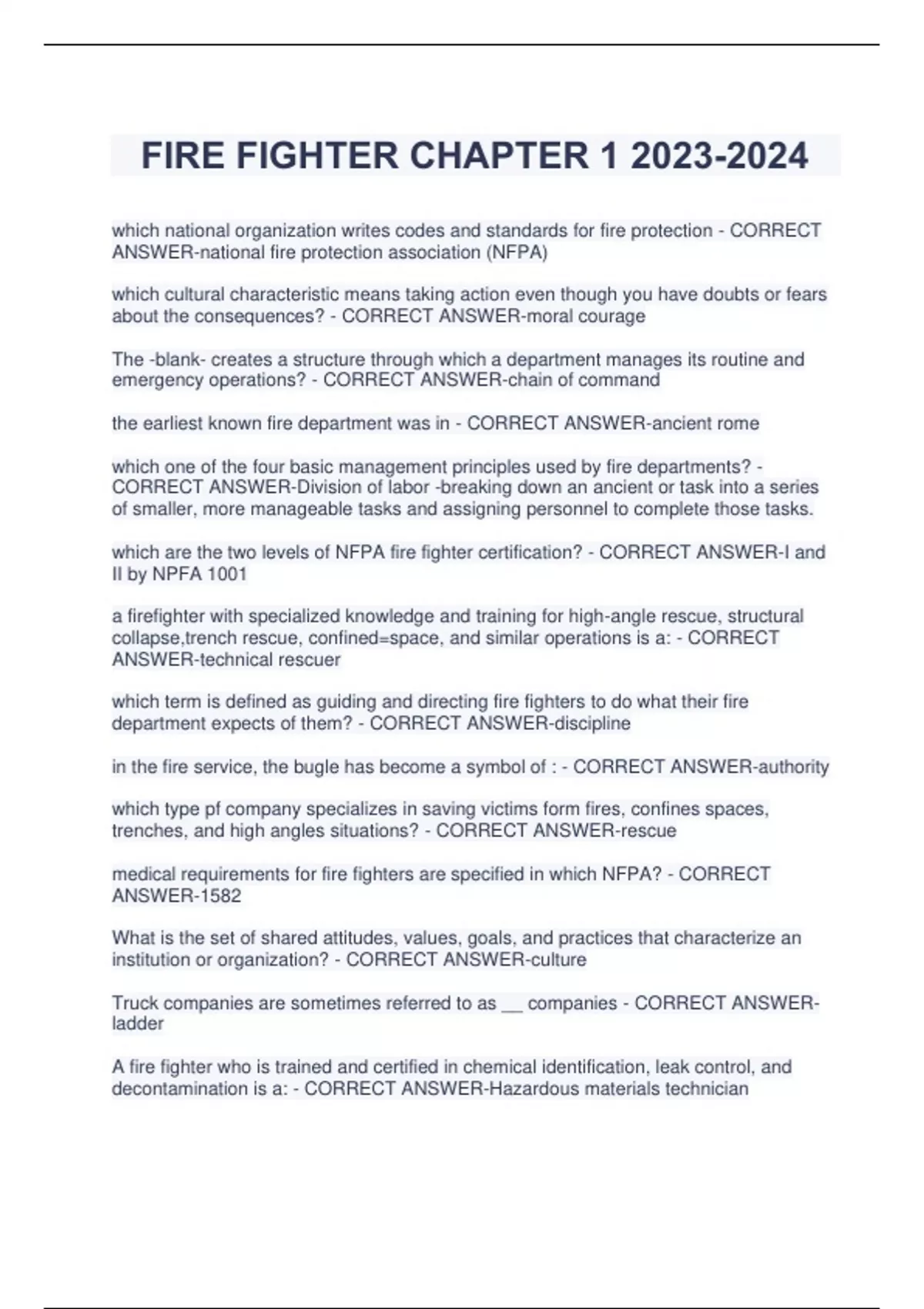 FIRE FIGHTER CHAPTER which national organization writes codes and standards for fire protection - CORRECT ANSWER-national fire protection association (NFPA) which cultural characteristic means taking action even though you have doubts or fears about the consequences? - CORRECT ANSWER-moral courage The -blank- creates a structure through which a department manages its routine and emergency operations? - CORRECT ANSWER-chain of command the earliest known fire department was in - CORRECT ANSWER-ancient rome which one of the four basic management principles used by fire departments? - CORRECT ANSWER-Division of labor -breaking down an ancient or task into a series of smaller, more manageable tasks and assigning personnel to complete those tasks. which are the two levels of NFPA fire fighter certification? - CORRECT ANSWER-I and II by NPFA 1001 a firefighter with specialized knowledge and training for high-angle rescue, structural collapse,trench rescue, confined=space, and similar operations is a: - CORRECT ANSWER-technical rescuer which term is defined as guiding and directing fire fighters to do what their fire department expects of them? - CORRECT ANSWER-discipline in the fire service, the bugle has become a symbol of : - CORRECT ANSWER-authority which type pf company specializes in saving victims form fires, confines spaces, trenches, and high angles situations? - CORRECT ANSWER-rescue medical requirements for fire fighters are specified in which NFPA? - CORRECT ANSWER-1582 What is the set of shared attitudes, values, goals, and practices that characterize an institution or organization? - CORRECT ANSWER-culture Truck companies are sometimes referred to as __ companies - CORRECT ANSWERladder A fire fighter who is trained and certified in chemical identification, leak control, and decontamination is a: - CORRECT ANSWER-Hazardous materials technician NFPA (national fire protection association) standards are _______ codes and standards: - CORRECT ANSWER-consensus-based specific information on the actions to be taken to accomplish a certain task is provided by: - CORRECT ANSWER-Standard operating procedures (SOP's) the goal of ________ is to ensure that all members of an agency perform a given task in a uniform way. - CORRECT ANSWER-Standard operating procedure (SOP's) Approximately______ percent of fire fighters in the united states are volunteers? - CORRECT ANSWER-70% a fire department has posted the following message in a prominent location: "the smith city fire department is committed to professional excellence through a tradition of protecting lives, property and the environment by providing the highest quality of service in prevention, fire protection, emergency medical services, and community preparedness." this is an example of a ______ statement. - CORRECT ANSWERmission A fire fighter will most typically report directly to a person of which rank? - CORRECT ANSWER-lieutenant which position specializes in reviewing plans for fire detection and suppression systems for functionality and code compliance? - CORRECT ANSWER-fire protection engineer the number of people whom one person can supervise effectively is known as: - CORRECT ANSWER-span of control usually 3-7 which are developed to provide definitive guidelines for present and future actions? - CORRECT ANSWER-policy in a typical fire department rank structure, an assistant chief reports directly to the: - CORRECT ANSWER-chief of the department 71% of career fire fighters work in jurisdictions with a population of __________ or more. - CORRECT ANSWER-25,000 where was the first fire insurance company former in america? - CORRECT ANSWERCharleston, South Carolina who developed the first fire hydrant? - CORRECT ANSWER-fredrick graft sr which rank is directly above a lieutenant in the fire service? - CORRECT ANSWERcaptain