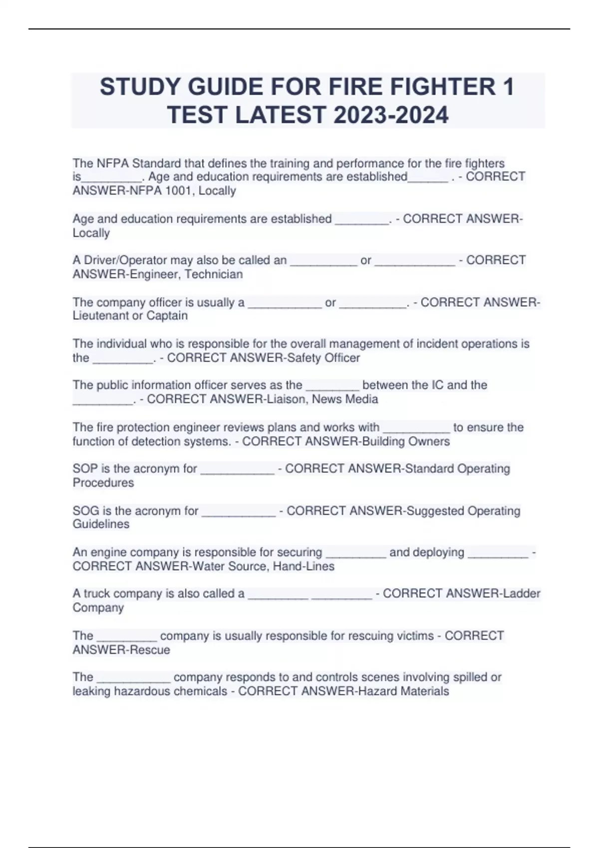 STUDY GUIDE FOR FIRE FIGHTER 1 TEST LATEST The NFPA Standard that defines the training and performance for the fire fighters is_________. Age and education requirements are established______ . - CORRECT ANSWER-NFPA 1001, Locally Age and education requirements are established ________. - CORRECT ANSWERLocally A Driver/Operator may also be called an __________ or ____________ - CORRECT ANSWER-Engineer, Technician The company officer is usually a ___________ or __________. - CORRECT ANSWERLieutenant or Captain The individual who is responsible for the overall management of incident operations is the _________. - CORRECT ANSWER-Safety Officer The public information officer serves as the ________ between the IC and the _________. - CORRECT ANSWER-Liaison, News Media The fire protection engineer reviews plans and works with __________ to ensure the function of detection systems. - CORRECT ANSWER-Building Owners SOP is the acronym for ___________ - CORRECT ANSWER-Standard Operating Procedures SOG is the acronym for ___________ - CORRECT ANSWER-Suggested Operating Guidelines An engine company is responsible for securing _________ and deploying _________ - CORRECT ANSWER-Water Source, Hand-Lines A truck company is also called a _________ _________ - CORRECT ANSWER-Ladder Company The _________ company is usually responsible for rescuing victims - CORRECT ANSWER-Rescue The ___________ company responds to and controls scenes involving spilled or leaking hazardous chemicals - CORRECT ANSWER-Hazard Materials Within the chain of command, fire fighters usually report to a _________ - CORRECT ANSWER-Lieutenant Captains report directly to a _________ - CORRECT ANSWER-Chief The fire service draws its authority from the _______ entity responsible for protecting the public - CORRECT ANSWER-Governing Who should firefighters consider themselves working for? - CORRECT ANSWER-Tax paying citizens who fund the department The fire department uses __________ style of leadership - CORRECT ANSWERParamilitary Describe the concept of discipline: - CORRECT ANSWER-Set guidelines the department establishes. Regulations, policies, and procedures are forms of discipline, that outline how things are to be done. What is Unity of Command - CORRECT ANSWER-The idea that each fire fighter answers to only one supervisor, each supervisor answers to only one boss What is meant of span of control - CORRECT ANSWER-Number of people whom one person can supervise effectively What historical events took place in the years 24 B.C. and 60 A.D. - CORRECT ANSWER-Roman Emperor Augustus Caesar created what is known as the first fire department. Corps of Vigiles established, adopting formal rank structure of the Roman Legion which is still used today The first document structure fire in North America occurred in what year? - CORRECT ANSWER-1607 Jamestown, Virginia The Chief's bugle became a symbol of ________ - CORRECT ANSWER-Authority Fire insurance was established in England after the _______ in 1666 - CORRECT ANSWER-Great Fire of London A historical event took place in 1736. What was it and where did it occur? - CORRECT ANSWER-First fire insurance company was established in Charleston, SC During a serious incident, the Safety Officer is responsible for evaluating hazards, and recommending __________ to the IC - CORRECT ANSWER-Appropriate safety measures Additionally each injury or accident must be __________ - CORRECT ANSWERThoroughly investigated and learned why it happened and how to avoid it Freelancing is ________ - CORRECT ANSWER-Acting independently of orders or SOPs or SOGs At the emergency, the safety officer reports to the _________ - CORRECT ANSWERIC How much time should all firefighters spend in physical training each day? - CORRECT ANSWER-one hour daily Explain how safety during training develops the proper working habits: - CORRECT ANSWER-Developing the proper working habits during training courses helps ensure safety later Teamwork is vital. What should take place if any member of the team becomes fatigued or must leave the training area: - CORRECT ANSWER-Notify the instructor or safety officer . EMS will be on standby to perform examination & refer further treatment Who does safe driving begin with? - CORRECT ANSWER-You A firefighting team should always consist of ________ who work together and are in ________ - CORRECT ANSWER-Two Firefighters, Constant contact with each other At an emergency incident, if one member of the team must leave the building, what must the rest of the team do - CORRECT ANSWER-Entire team must leave An accountability system should record - CORRECT ANSWER-Individual assigned to each company, crew, or entry teams If a Safety Officer is not on the scene, another person should - CORRECT ANSWER-be assigned to monitor the atmosphere for the presence of carbon dioxide If a single firefighter has to lift something that is very heavy, he/she should - CORRECT ANSWER-Never bend by the waist to lift an object Bending should be done by - CORRECT ANSWER-The knees and use legs to lift, never by the waist The systematic process that provides periods of rest and recovery is - CORRECT ANSWER-Rehabilitation What are some of the signs of heat stroke - CORRECT ANSWER-Lack of sweat, low blood pressure, shallow breathing, and seizures How much of the body should a firefighter's structural firefighting gear cover? - CORRECT ANSWER-Every inch of the body The protective hood provides additional thermal protection for which area of the body - CORRECT ANSWER-Ears and neck when flexed Explain the purpose of the PASS - CORRECT ANSWER-Electronic device that sounds a loud audible signal when the firefighter is trapped or disabled The time period that a firefighter should be able to don his/her PPC is - CORRECT ANSWER-1 minute One limitation of an SCBA is the physical limitations of the user. Another is psychological limitations of the - CORRECT ANSWER-User SCBA Harness - CORRECT ANSWER-Consists of the straps and fasteners to adjust th