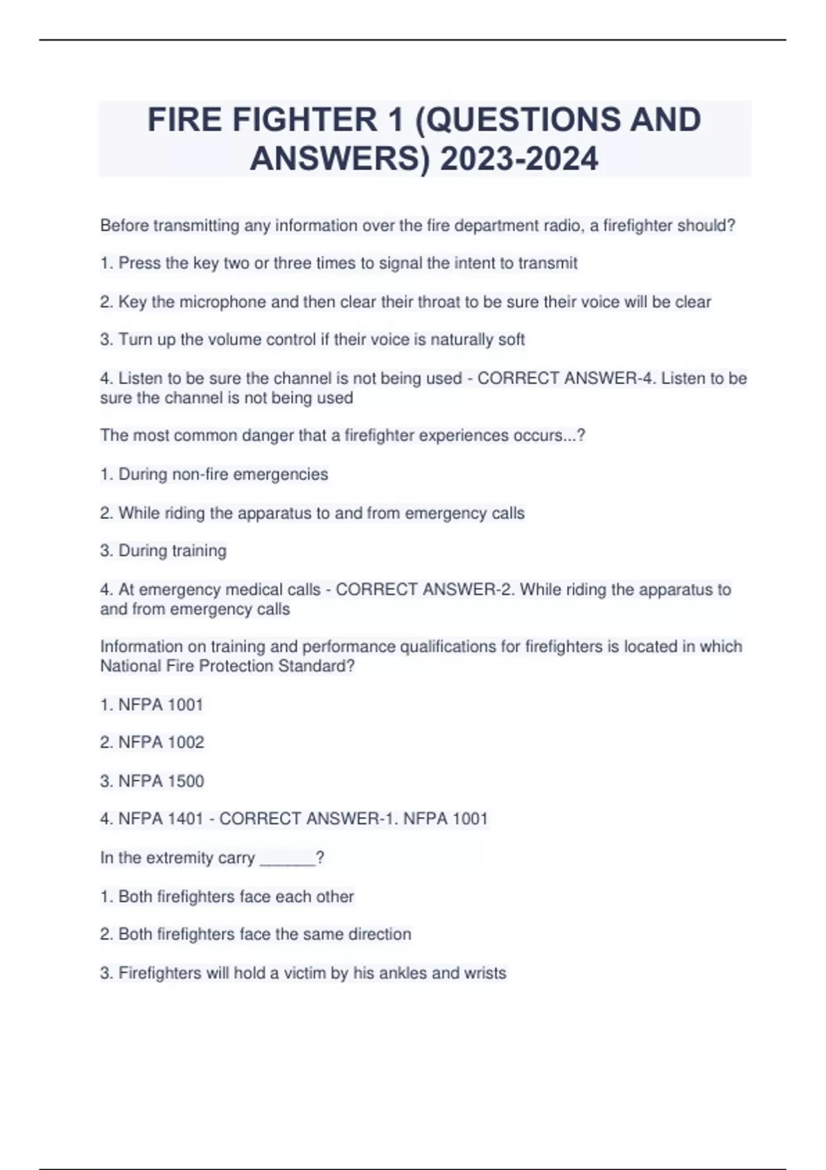 FIRE FIGHTER 1 (QUESTIONS AND ANSWERS) Before transmitting any information over the fire department radio, a firefighter should? 1. Press the key two or three times to signal the intent to transmit 2. Key the microphone and then clear their throat to be sure their voice will be clear 3. Turn up the volume control if their voice is naturally soft 4. Listen to be sure the channel is not being used - CORRECT ANSWER-4. Listen to be sure the channel is not being used The most common danger that a firefighter experiences occurs...? 1. During non-fire emergencies 2. While riding the apparatus to and from emergency calls 3. During training 4. At emergency medical calls - CORRECT ANSWER-2. While riding the apparatus to and from emergency calls Information on training and performance qualifications for firefighters is located in which National Fire Protection Standard? 1. NFPA 1001 2. NFPA 1002 3. NFPA 1500 4. NFPA 1401 - CORRECT ANSWER-1. NFPA 1001 In the extremity carry ______? 1. Both firefighters face each other 2. Both firefighters face the same direction 3. Firefighters will hold a victim by his ankles and wrists 4. The victim and firefighter keep low to the ground - CORRECT ANSWER-2. Both firefighters face the same direction The least desirable point to force entry into a structure is? 1. A check rail window 2. A swinging door 3. Plate glass 4. A revolving door - CORRECT ANSWER-4. A revolving door The principle that most closely describes how water extinguishes fire is? 1. Removal of fuel 2. Reduction of temperature 3. Exclusion of oxygen 4. Inhibition of chain reaction - CORRECT ANSWER-2. Reduction of temperature Which would be effective in breaking up various types of materials found in stacked, piled materials? 1. Rubbish hooks and rakes 2. Crowbars and halligan tools 3. Power tools 4. Axes - CORRECT ANSWER-1. Rubbish hooks and rakes Immobilizing a victim who is suspected of having a spinal injury on a long backboard requires ______ rescuers. 1. Two rescuers 2. Three rescuers 3. Four rescuers 4. Five rescuers - CORRECT ANSWER-3. Four rescuers In the term LUNAR, the L stands for 1. Location 2. Low on air 3. Lead firefighter is coming out 4. Ladder side A for firefighters coming out - CORRECT ANSWER-1. Location What should a a firefighter do is their SCBA becomes damaged or malfunctions? 1. Use a protective hood as a filter 2. Deactivate the PASS device 3. Remain calm and stay with their team 4. Run for the nearest exit as quickly as possible - CORRECT ANSWER-3. Remain calm and stay with their team How many methods are there for properly heeling a raised ground ladder? 1. One 2. Two 3. Three 4. Four - CORRECT ANSWER-2. Two Which is true regarding SCBA? 1. Tighten the top straps of the facepiece first 2. All SCBA facepieces must be fit tested 3. Hoods should be worn under the SCBA straps and facepiece 4. Positive pressure should not be tested by breaking the regulator seal - CORRECT ANSWER-2. All SCBA facepieces must be fit tested Which is one of the major lock categories? 1. Mortise locks 2. Oval 3. Rabetted locks 4. Tumbled locks - CORRECT ANSWER-1. Mortise locks Which is one of the recommended steps in fighting a fire in an electrically powered vehicle? 1. Cut into high-voltage components 2. Secure and stabilize the vehicle 3. Use hand tools in order not to touch high-voltage cables 4. Do not use water for the fire extinguishment as there is a risk of high voltage - CORRECT ANSWER-2. Secure and stabilize the vehicle The parts of an extension ladder that prevent the fly sections from being over-extended are called? 1. Guides 2. Locks 3. Anchors 4. Stops - CORRECT ANSWER-4. Stops When advancing dry fire hose up a multi-section ladder, firefighters should climb approximately _______ ladder section(s) apart from one another. 1. 1 2. 1.5 3. 2 4. 2.5 - CORRECT ANSWER-1. 1 During an attack on a confined interior building fire, if a fog stream is applied incorrectly, it can upset ______? 1. Thermal layer 2. Vapor laye