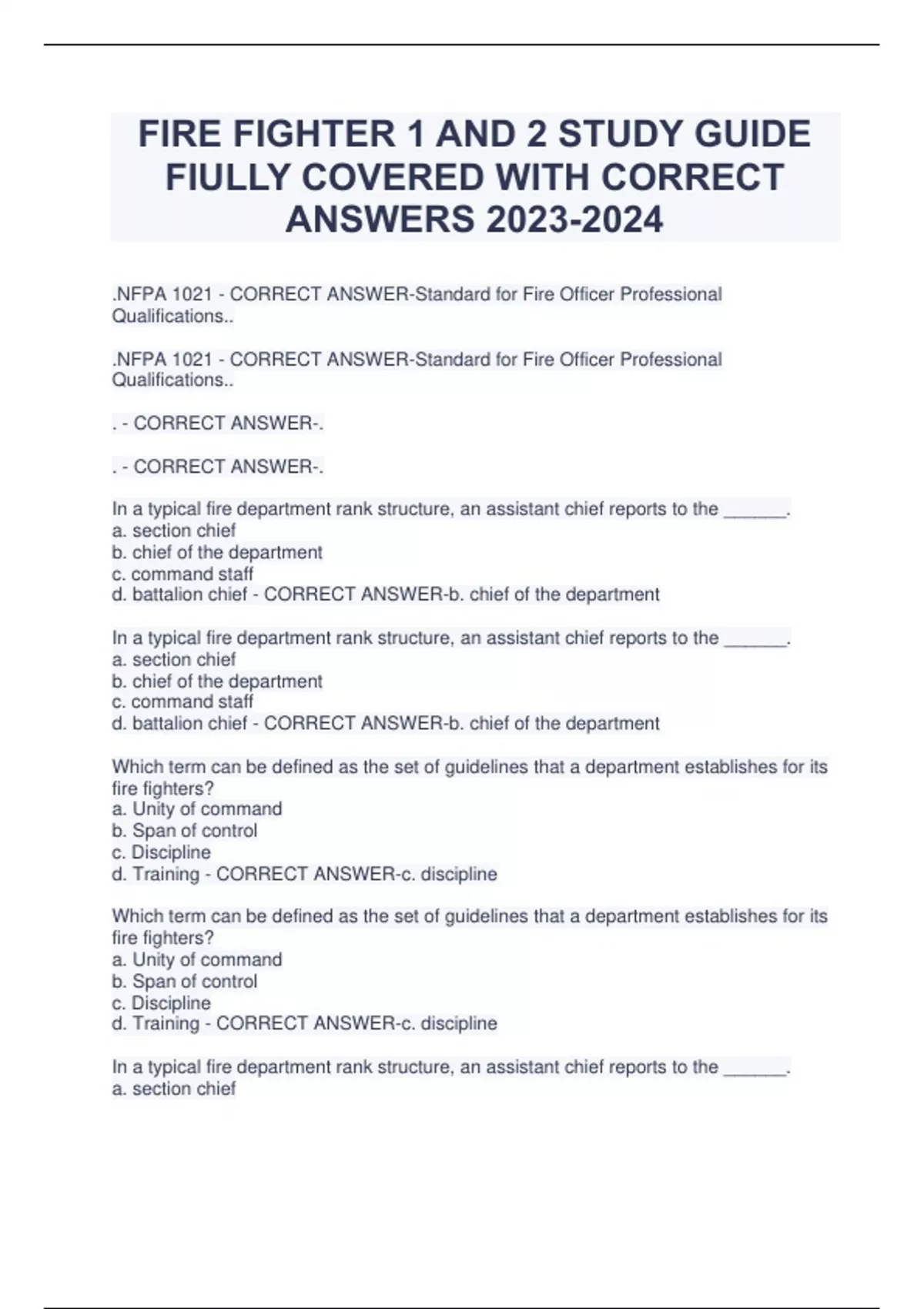 FIRE FIGHTER 1 AND 2 STUDY GUIDE FIULLY COVERED WITH CORRECT ANSWERS .NFPA 1021 - CORRECT ANSWER-Standard for Fire Officer Professional Qualifications.. .NFPA 1021 - CORRECT ANSWER-Standard for Fire Officer Professional Qualifications.. . - CORRECT ANSWER-. . - CORRECT ANSWER-. In a typical fire department rank structure, an assistant chief reports to the ______. a. section chief b. chief of the department c. command staff d. battalion chief - CORRECT ANSWER-b. chief of the department In a typical fire department rank structure, an assistant chief reports to the ______. a. section chief b. chief of the department c. command staff d. battalion chief - CORRECT ANSWER-b. chief of the department Which term can be defined as the set of guidelines that a department establishes for its fire fighters? a. Unity of command b. Span of control c. Discipline d. Training - CORRECT ANSWER-c. discipline Which term can be defined as the set of guidelines that a department establishes for its fire fighters? a. Unity of command b. Span of control c. Discipline d. Training - CORRECT ANSWER-c. discipline In a typical fire department rank structure, an assistant chief reports to the ______. a. section chief b. chief of the department c. command staff d. battalion chief - CORRECT ANSWER-b. Chief of the Department In a typical fire department rank structure, an assistant chief reports to the ______. a. section chief b. chief of the department c. command staff d. battalion chief - CORRECT ANSWER-b. Chief of the Department Which of the following are developed to provide definitive guidelines for present and future actions? a. Regulations b. Standard operating procedures c. Policies D. After action reports - CORRECT ANSWER-c. Policies Which of the following are developed to provide definitive guidelines for present and future actions? a. Regulations b. Standard operating procedures c. Policies D. After action reports - CORRECT ANSWER-c. Policies Which term can be defined as the set of guidelines that a department establishes for its fire fighters? a. Unity of command b. Span of control c. Discipline d. Training - CORRECT ANSWER-c. Discipline Which term can be defined as the set of guidelines that a department establishes for its fire fighters? a. Unity of command b. Span of control c. Discipline d. Training - CORRECT ANSWER-c. Discipline Truck companies are sometimes referred to as ______ companies. a. rapid intervention b. rescue c. ladder e - CORRECT ANSWER-c. Ladder Truck companies are sometimes referred to as ______ companies. a. rapid intervention b. rescue c. ladder e - CORRECT ANSWER-c. Ladder For whom should fire fighters consider that they work? a. The tax paying citizens b. Themselves c. Their supervisors d. Their team - CORRECT ANSWER-a. the tax paying citizens For whom should fire fighters consider that they work? a. The tax paying citizens b. Themselves c. Their supervisors d. Their team - CORRECT ANSWER-a. the tax paying citizens The number of people whom one person can supervise effectively is known as ______. a. chain of command b. division of labor c. span of control d. functional supervision - CORRECT ANSWER-c. span of control The number of people whom one person can supervise effectively is known as ______. a. chain of command b. division of labor c. span of control d. functional supervision - CORRECT ANSWER-c. span of control Which development led to the widespread use of the mechanized pumping apparatus? a. Private insurance companies b. Wagon mounted steam engines c. Jacketed hose d. Internal combustion engines - CORRECT ANSWER-d. Internal combustion engines Which development led to the widespread use of the mechanized pumping apparatus? a. Private insurance companies b. Wagon mounted steam engines c. Jacketed hose d. Internal combustion engines - CORRECT ANSWER-d. Internal combustion engines In the fire service, the bugle has become a symbol of _____. a. authority b. courage c. fraternity d. service - CORRECT ANSWER-a. authority In the fire service, the bugle has become a symbol of _____. a. authority b. courage c. fraternity d. service - CORRECT ANSWER-a. authority Medical requirements for fire fighters are specified in which NFPA standard? a. 1002 b. 1582 c. 1962 d. 904 - CORRECT ANSWER-b. 1582 Medical requirements for fire fighters are specified in which NFPA standard? a. 1002 b. 1582 c. 1962 d. 904 - CORRECT ANSWER-b. 1582 Which type of company specializes in saving victims from fires, confined spaces, trenches, and high angle situations? a. Rescue b. Rapid Intervention c. Truck d. Engine - CORRECT ANSWER-a. Rescue Which type of company specializes in saving victims from fires, confined spaces, trenches, and high angle situations? a. Rescue b. Rapid Intervention c. Truck d. Engine - CORRECT ANSWER-a. Rescue NFPA standards are ________. a. regulatory law b. administrative law c. consensus documents d. model codes - CORRECT ANSWER-c. consensus documents NFPA standards are ________. a. regulatory law b. administrative law c. consensus documents d. model codes - CORRECT ANSWER-c. consensus documents Which rank is directly above a lieutenant in the fire service? a. Division/group supervisor b. Division chief c. Captain d. Battalion chief - CORRECT ANSWER-c. Captain Which rank is directly above a lieutenant in the fire service? a. Division/group supervisor b. Division chief c. Captain d. Battalion chief - CORRECT ANSWER-c. Captain What does the "S" stand for in "SOP"? a. Standard b. Sequential c. Specific d. Special - CORRECT ANSWER-a. Standard What does the "S" stand for in "SOP"? a. Standard b. Sequential c. Specific d. Special - CORRECT ANSWER-a. Standard Where was the first fire insurance company formed in America? a. New York, New York b. Boston, Massachusetts c. Charleston, South Carolina d. Chicago, Illinois - CORRECT ANSWER-c. Charleston, South Carolina Where was the first fire insurance company formed in America? a. New York, New York b. Boston, Massachusetts c. Charleston, South Caro