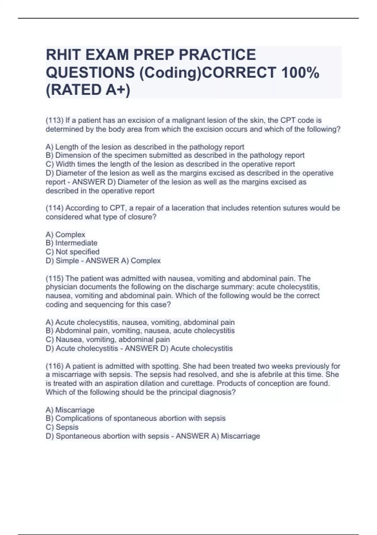 (113) If a patient has an excision of a malignant lesion of the skin, the CPT code is determined by the body area from which the excision occurs and which of the following? A) Length of the lesion as described in the pathology report B) Dimension of the specimen submitted as described in the pathology report C) Width times the length of the lesion as described in the operative report D) Diameter of the lesion as well as the margins excised as described in the operative report - ANSWER D) Diameter of the lesion as well as the margins excised as described in the operative report (114) According to CPT, a repair of a laceration that includes retention sutures would be considered what type of closure? A) Complex B) Intermediate C) Not specified D) Simple - ANSWER A) Complex (115) The patient was admitted with nausea, vomiting and abdominal pain. The physician documents the following on the discharge summary: acute cholecystitis, nausea, vomiting and abdominal pain. Which of the following would be the correct coding and sequencing for this case? A) Acute cholecystitis, nausea, vomiting, abdominal pain B) Abdominal pain, vomiting, nausea, acute cholecystitis C) Nausea, vomiting, abdominal pain D) Acute cholecystitis - ANSWER D) Acute cholecystitis (116) A patient is admitted with spotting. She had been treated two weeks previously for a miscarriage with sepsis. The sepsis had resolved, and she is afebrile at this time. She is treated with an aspiration dilation and curettage. Products of conception are found. Which of the following should be the principal diagnosis? A) Miscarriage B) Complications of spontaneous abortion with sepsis C) Sepsis D) Spontaneous abortion with sepsis - ANSWER A) Miscarriage (117) An 80-year-old female is admitted with fever, lethargy, hypotension, tachycardia, oliguria, and elevated WBC. The patient has more than 100,000 organisms of Escherichia coli per cc of urine. The attending physician documents "urosepsis". How should this case be coded? A) Code sepsis as the principal diagnosis with urinary tract infection due to E.coli as secondary diagnosis B) Code urinary tract infection with sepsis as the principal diagnosis C) Query the physician to ask if the patient has septicemia because of the symptomatology D) Query the physician to ask if the patient had septic shock so that this may be used as the principal diagnosis - ANSWER C) Query the physician to ask if the patient has septicemia because of the symptomatology (118) The practice of using a code that results in a higher payment to the provider than the code that actually reflects the service or item provided is known as: A) Unbundling B) Upcoding C) Medically unnecessary services D) Billing for services not provided - ANSWER B) Upcoding (119) A 65 year-old patient with a history of lung cancer is admitted to a healthcare facility with ataxia and syncope and a fractured arm as a result of falling. The patient undergoes a closed reduction of the fracture in the emergency department as well as a complete workup for metastatic carcinoma of the brain. The patient is found to have metastatic carcinoma of the lung to the brain and undergoes radiation therapy to the brain. Which of the following would be the principal diagnosis in this case? A) Ataxia B) Fractured arm C) Metastatic carcinoma of the brain D) Carcinoma of the lung - ANSWER C) Metastatic carcinoma of the brain (120) A patient was admitted for abdominal pain with diarrhea and was diagnosed with infectious gastroenteritis. The patient also had angina and chronic obstructive pulmonary disease. Which of the following would be the correct coding and sequencing for this case? A) Abdominal pain; infectious gastroenteritis; chronic obstructive pulmonary disease; angina B) Infectious gastroenteritis; chronic obstructive pulmonary disease; angina C) Gastroenteritis; abdominal pain; angina D) Gastroenteritis; abdominal pain; diarrhea; chronic obstructive pulmonary disease; angina - ANSWER B) Infectious gastroenteritis; chronic obstructive pulmonary disease; angina (121) A patient is admitted with a history of prostate cancer and with mental confusion. The patient completed radiatRHIT EXAM PREP PRACTICE QUESTIONS (Coding)CORRECT 100%(RATED A+)