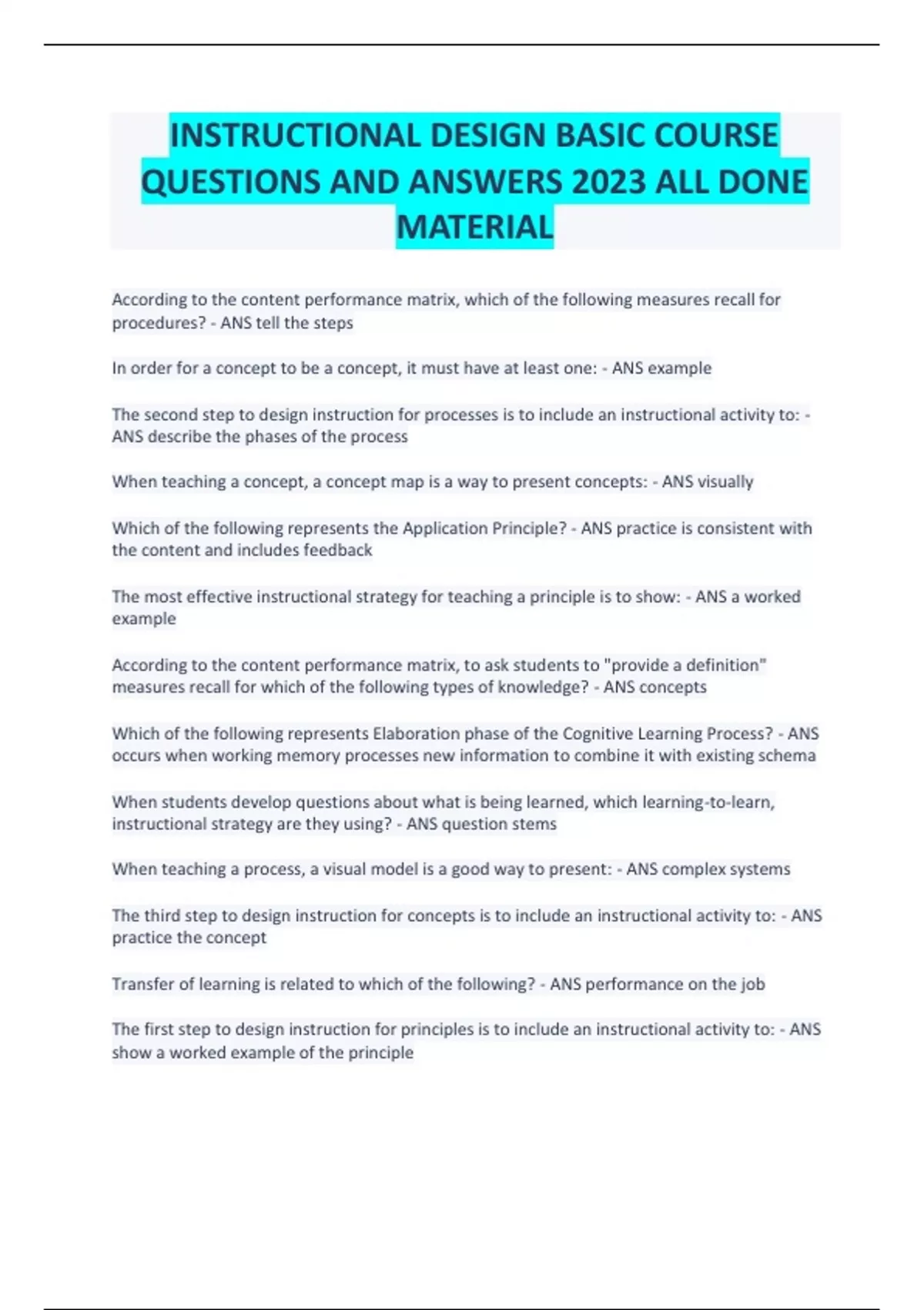 INSTRUCTIONAL DESIGN BASIC COURSE QUESTIONS AND ANSWERS 2023 ALL DONE MATERIAL