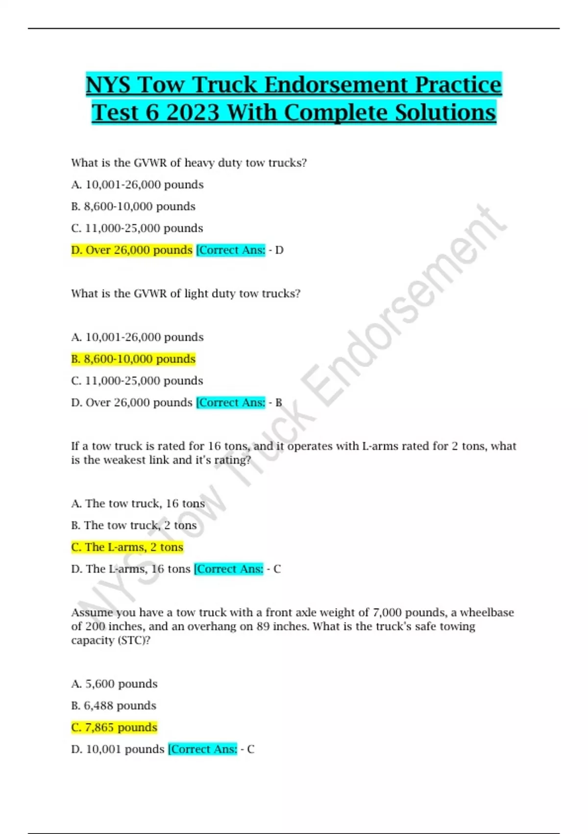 NYS Tow Truck Endorsement Practice Test 6 2023 With Complete Solutions,NYS Tow Truck Endorsement Practice Test 6 2023 With Complete Solutions
