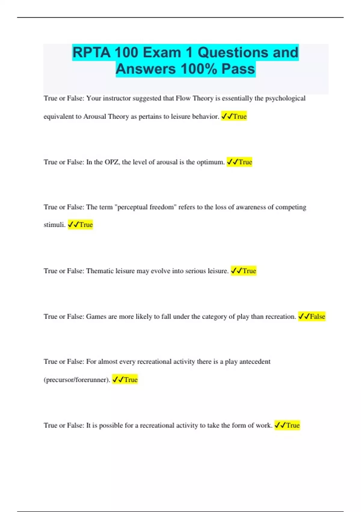 RPTA 100 Exam 1 Questions and Answers 100% Pass True or False: Your instructor suggested that Flow Theory is essentially the psychological equivalent to Arousal Theory as pertains to leisure behavior. True True or False: In the OPZ, the level of arousal is the optimum. True True or False: The term "perceptual freedom" refers to the loss of awareness of competing stimuli. True True or False: Thematic leisure may evolve into serious leisure. True True or False: Games are more likely to fall under the category of play than recreation. False True or False: For almost every recreational activity there is a play antecedent (precursor/forerunner). True True or False: It is possible for a recreational activity to take the form of work. True From the Terminology slide show/lecture, how did your instructor argue that play and recreation fall on a continuum? Play and recreation are often polar opposites, for example, play is spontaneous, recreation planned/organized From the Terminology slide show/lecture, Robert Stebbins is cited as arguing that leisure falls into two broad categories. What are these categories? casual and serious leisure The slide show (Discovery) and lecture identified 5 elements necessary for effective leisure functioning. Which is not one of those elements? external or extrinsic reward Leisure education is an important contributor to furthering leisure in a person's life. What is the fundamental goal of leisure education as described in the Discovery slide show? Facilitate self-determination in reference to the unique nature of each individual. During the first lecture, your instructor talked about the tendency of people to develop routines, habits, and behavior patterns that become resistant to change. He called this tendency... The Behavioral Rut Which of the following are the factors necessary to create and sustain macroplay? a. adequate time b. appropriate attitude c. an environment (social and physical) conducive to playful behavior d. all of the aboveANSWER e. none of the above Your author makes an observation about microplay as exhibited by his colleagues. What did he observe? In a meeting, he observed 137 examples of microplay exhibited by 37 people. Your author described play as falling on which of the following continuums? Functional-dysfunctional. Under the heading "Some Other Facts About Play," your author makes which of the following observations? Play is generally found in the behavior of mammals. Your textbook and the slideshow both make an important claim regarding the relationship of play to leisure. What is this claim? Play generally is perceptually freeing, and from that perspective can be generally considered an example of leisure. The textbook identifies 8 characteristics generally associated with play or playful behavior. Of the following, which is not one of those characteristics. Tends to be well organized From the slide show, which of the following is not considered a quantitative definition? The state-of-mind definition. What is the primary criterion for identifying the state-of-mind perspective of leisure? Perceptual freedom. From the slide show, according to Neulinger, when a person is motivated to engage in an activity solely for extrinsic reasons, which of the following must follow? The experience could not be considered a leisure activity. What are the two essential psychological constructs necessary for a person to experience leisure according to Dr. John Neulinger? perceived freedom, and intrinsic rewards/motivation The textbook identifies three leisure perspectives or forms/type/categories of leisure, what are they? Activity-based-leisure, time-based-leisure, or state of mind-leisure (spiritual leisure) Dr. Carol Stensrud coined a term that refers to the idea that leisure can be a source of delight, what is this word, and why is it important? The word is pleisure; it is important because it shows that one talking about leisure as an intrinsic experience. The text speak of "bits of leisure time." What is the significance of bits of leisure? Research suggests that bits of leisure time can provide context for microflow experiences. Which is not one of the top ten reasons, stated in the text, for making leisure an important part of your life. You Will Find It Easy to Achieve Wealth What does the term effective leisure functioning mean? It refers to selecting leisure activities that have the potential to produce positive gains or outcomes in a person's life. What does the textbook say about the relationship of leisure to freedom. a. It argues that during leisure one is freed from the awareness of the elements that contribute to the chaos of the world in which we live. b. It argues that when one is freed from the awareness of negative elements, one becomes revitalized and better able to cope with disorganizing events or influences. c. It argues that leisure does not require either freedom or perceived freedom. d. Both a and b are correct. e. None of the above. ANSWER: D What is the basic purpose of the textbook? To help the reader learn to use leisure as a means of coping with the stress of living in a chaotic world. The leisure research continuum as shown in the slide presentation ranges from between what types of research? quantitative and qualitative Of the following statements regarding random samples in leisure research, which is/are correct? a. Often the populations under study are too large to involve everyone in the research. b. Nonrandom samples may not represent the larger population from which they derive. c. A random sample enhances the probability that results can be generalized to the larger population. d. All of the above are correct. ANSWER Can a leisure research test be reliable but not valid? Yes. You can get the same incorrect results over and over again What is reliability? The ability of a test to get the same results over repeated applications. What is validity? The capacity of a study or test to measure what it purports (inten