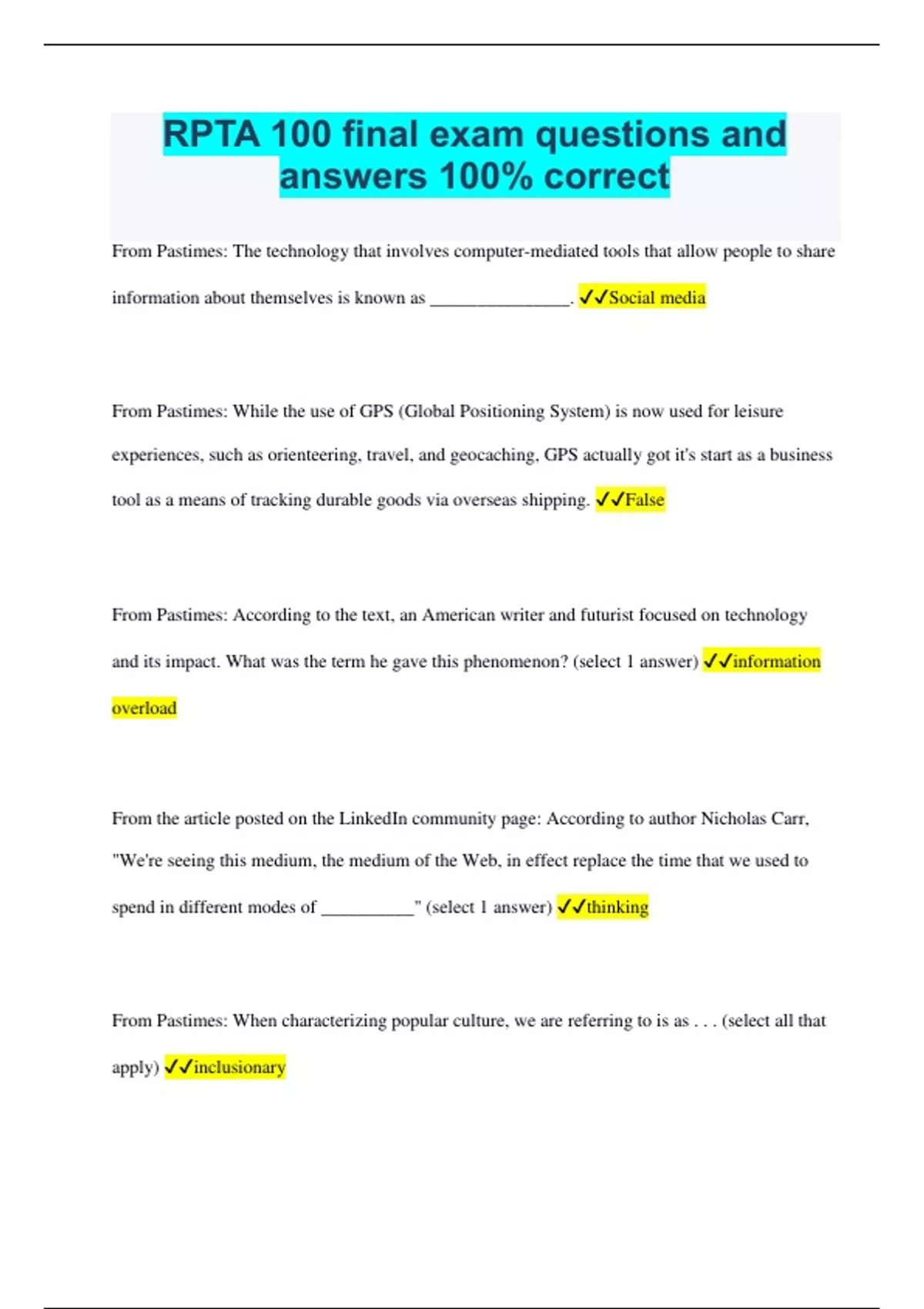 RPTA 100 final exam questions and answers 100% correct From Pastimes: The technology that involves computer-mediated tools that allow people to share information about themselves is known as _______________. Social media From Pastimes: While the use of GPS (Global Positioning System) is now used for leisure experiences, such as orienteering, travel, and geocaching, GPS actually got it's start as a business tool as a means of tracking durable goods via overseas shipping. False From Pastimes: According to the text, an American writer and futurist focused on technology and its impact. What was the term he gave this phenomenon? (select 1 answer) information overload From the article posted on the LinkedIn community page: According to author Nicholas Carr, "We're seeing this medium, the medium of the Web, in effect replace the time that we used to spend in different modes of __________" (select 1 answer) thinking From Pastimes: When characterizing popular culture, we are referring to is as . . . (select all that apply) inclusionary commercial popular specific to age group trendy From Pastimes: __________________________ is part of our evolutionary heritage, a built-in sensitivity to movement from potential threats. orienting response From Pastimes: The stylistic features of television, such as cuts, edits, zooms, pans, and sudden noises, activate the sub-neocortex, thereby keeping our attention on the screen. False From Pastimes: Ideational mentality means that something is bad based on your own ideas, whereas sensate mentality means something is bad based on your own experience. True From Pastimes: The root concept of taboo recreation is deviance, any behavior that violates a groups norms. Match the description of behavior to the definition. acts of deviance that are against the law: formal deviance behavior and consequences are more casual because the group's norms do not have a legal consequences: informal deviance unseemly ways of performing for others: playful deviance pastimes typical of working classes of people: prole leisure From Pastimes: There are 3 explanations for deviant behavior that leads to taboo recreation. Those 3 theoretical positions are . . . . (select 3 answers) anomie retreatism differential association From Pastimes: In truth (according to the author), everyone is involved at least occasionally in deviant behavior. True From the article posted on LinkedIn: Research shows that the teenage ____________ is very active," says Davidow. This suggests that teens are hard-wired to seek immediate rewards. But, she adds, it's also shown that their _________________, which helps with impulse control, isn't fully developed. Combined, these two things have given teens their risky reputation. striatium, prefrontal cortex From Pastimes: Time used for leisure is essentially shaped by 4 factors, which are (select 4 answers): personal amounts of free time the time needs of leisure activities personal perceptions of free time a culture's time sufficiency From Pastimes: When our work is a central life interest, we identify with our work role and see work as an important aspect of life. true From Pastimes: ________________ is buying things that are unnecessary in an exaggerated way and has emotional, social, and psychological origins, as well as economic origins, that encourage people to buy things they can and cannot buy to evade social discrimination. consumerism From the video on LinkedIn: What did the speaker in the video say were the 3 factors that the science shows lead to better performance at work and greater personal satisfaction with one's work? (select 1 answer) autonomy, mastery, and purpose From Pastimes: As a privilege, sometimes the qualifier for leisure is having enough money to pay for leisure experiences, while at other times it is feeling guilt-free because we have worked hard all week and can take a few days off on the weekend. true From Pastimes: According to the leisure constraints model, the three constraints that influence a person's participation in leisure are: (select 3 answers) interpersonal intrapersonal structural From Pastimes: __________ means the involvement and full acceptance of all people within the wider range of community settings and valuing all people regardless of their differences. inclusion From Pastimes: At the core of inclusive leisure services are several fundamental principles about leisure and disability. They are:(select 4 answers) self-determination integration normalization self-advocacy From Pastimes:What are the 3 leisure service sponsor types? (select 1 answer) Public, private, and commercial From Pastimes: Enabling legislation is when the United States government makes grant funding available to state governments for non-leisure purposes, but not to local governments, like counties, cities, and special districts for leisure purposes. false From Pastimes: A school club that brings together people of similar interests that allows them to network is an example of ----------?individual in the club who has knowledge and experience, and possibly knows people that might be of benefit to the club is said to have-----------? social capital cultural capital