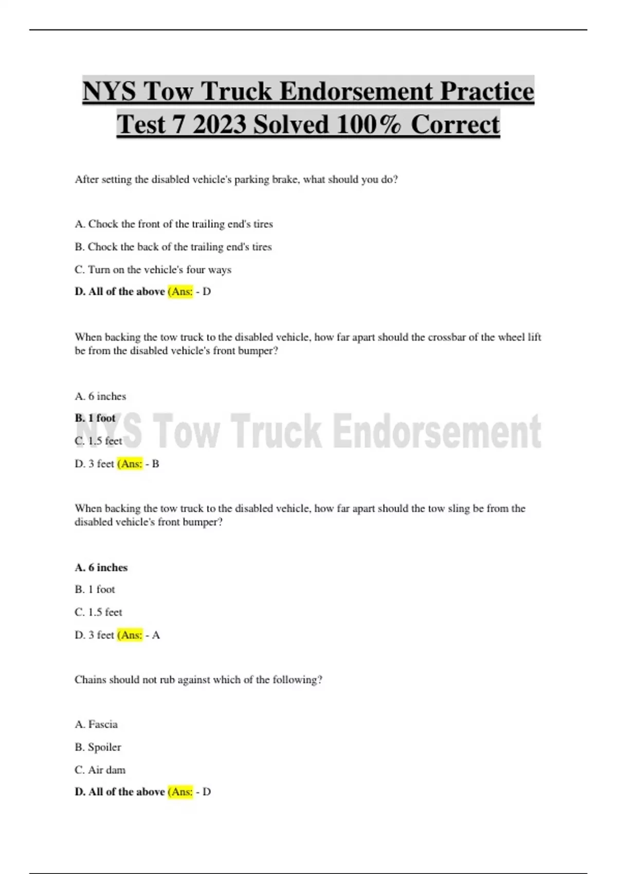 NYS Tow Truck Endorsement Practice Test 7 2023 Solved 100% Correct,NYS Tow Truck Endorsement Practice Test 7 2023 Solved 100% Correct,NYS Tow Truck Endorsement Practice Test 7 2023 Solved 100% Correct