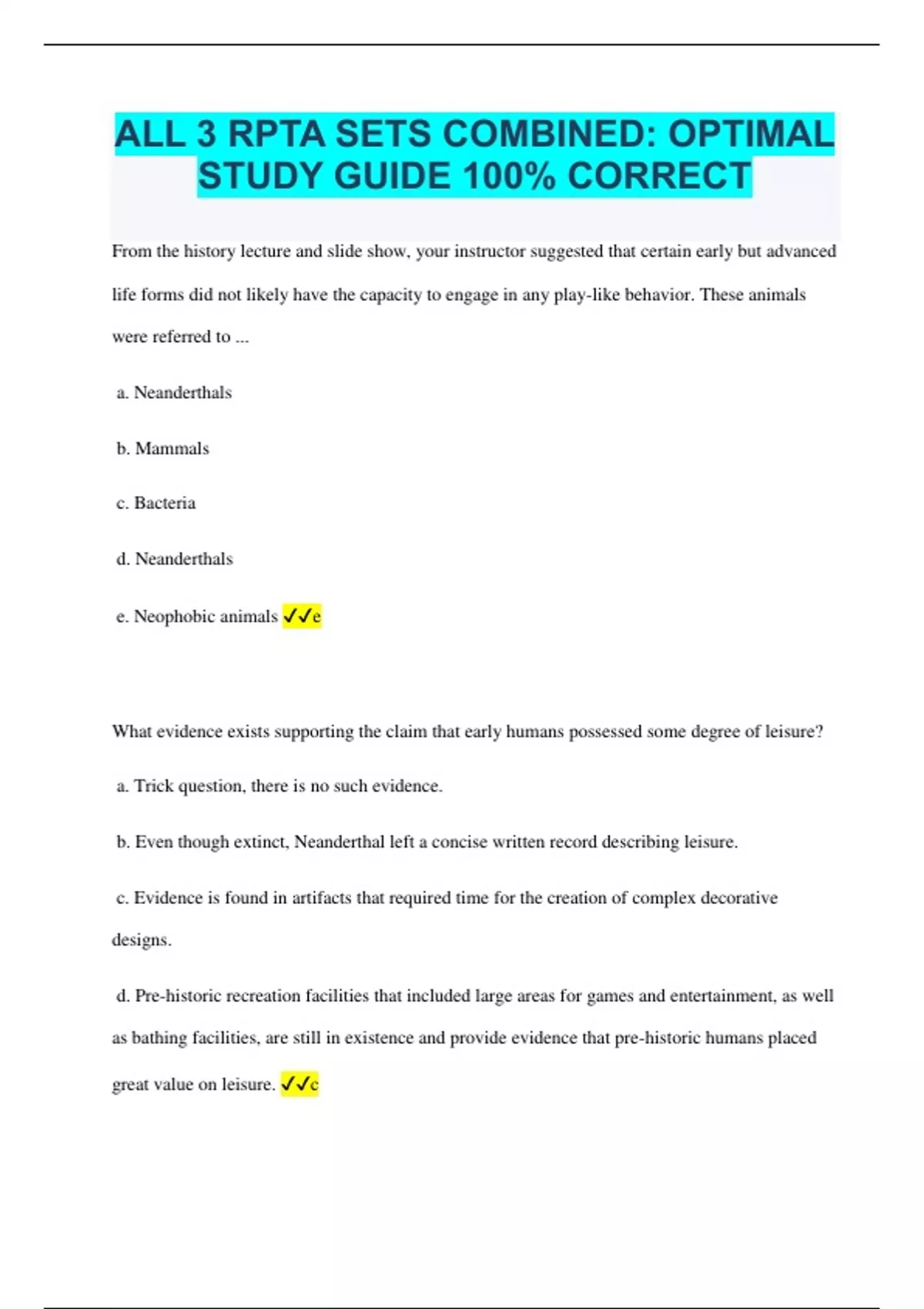 ALL 3 RPTA SETS COMBINED: OPTIMAL STUDY GUIDE 100% CORRECT From the history lecture and slide show, your instructor suggested that certain early but advanced life forms did not likely have the capacity to engage in any play-like behavior. These animals were referred to ... a. Neanderthals b. Mammals c. Bacteria d. Neanderthals e. Neophobic animals e What evidence exists supporting the claim that early humans possessed some degree of leisure? a. Trick question, there is no such evidence. b. Even though extinct, Neanderthal left a concise written record describing leisure. c. Evidence is found in artifacts that required time for the creation of complex decorative designs. d. Pre-historic recreation facilities that included large areas for games and entertainment, as well as bathing facilities, are still in existence and provide evidence that pre-historic humans placed great value on leisure. c In terms of recreation and leisure, how did Ancient Greece compare to Ancient Rome? a. Ancient Greeks had an idealistic view of leisure; Romans had a pragmatic, utilitarian view of leisure. b. Ancient Greeks viewed leisure as undesirable; Romans saw it as entertainment and pleasure seeking characterized ancient Rome. c. Ancient Greeks tended to be pleasure seekers; ancient Romans focused more on culture and art. e. None of the above. a Why is the Renaissance viewed as an important historical landmark in leisure history? a. It marked the beginning of the Dark Ages. b. It restored leisure to a status somewhat similar to that held in prehistoric times. c. It marked a return to cultural activities such as dance, theater, and music. d. It produced many remarkable thinkers, artists, and philosophers. e. Both C and D e What is the significance of the Boston Sandgardens in relation to leisure history? a. Most historians give credit to the Boston Sandgardens as the inception of the recreation movement. b. The Boston Sandgardens was the name of the first professional baseball team in Boston. c. The Boston Sandgardens was a company that contributed sand to the playgrounds of Boston. d. a and c are both correct e. None of the above. a During the late 19th century and the early 20th century, a number of important events occurred that enabled the recreation movement, and the playground movement, to make great strides. What were some of these events? a. In 1906, a group of socially conscious leaders met in Washington D.C. to resolve some of the recreation and leisure problems of the day. This led to the founding of the American Playground Association. The name was later changed in 1911 to the Playground and Recreation Association b. In 1906, Congress passed the Antiquities Act, giving the President the power to designate national monuments and protect them from being destroyed c. The establishment of the National Park Service. d. Agencies were established during the Great Depression that led to the creation of parks and recreation facilities, many of which we use today. e. All of the above. e The word "philosophy" in its literal Greek sense means ____________________. a. love of reason b. love of wisdom c. love of knowledge d. love of logic e. none of the above b Philosophers often use the following kind of logic: Premise: When Bill is home his car is always in the driveway. Premise: Bill's car is in the driveway. Conclusion: Bill is home. This an example of which of the following: a. Inductive reasoning b. Deductive reasoning c. Syllogistic Reasoning d. Both B and C d What is