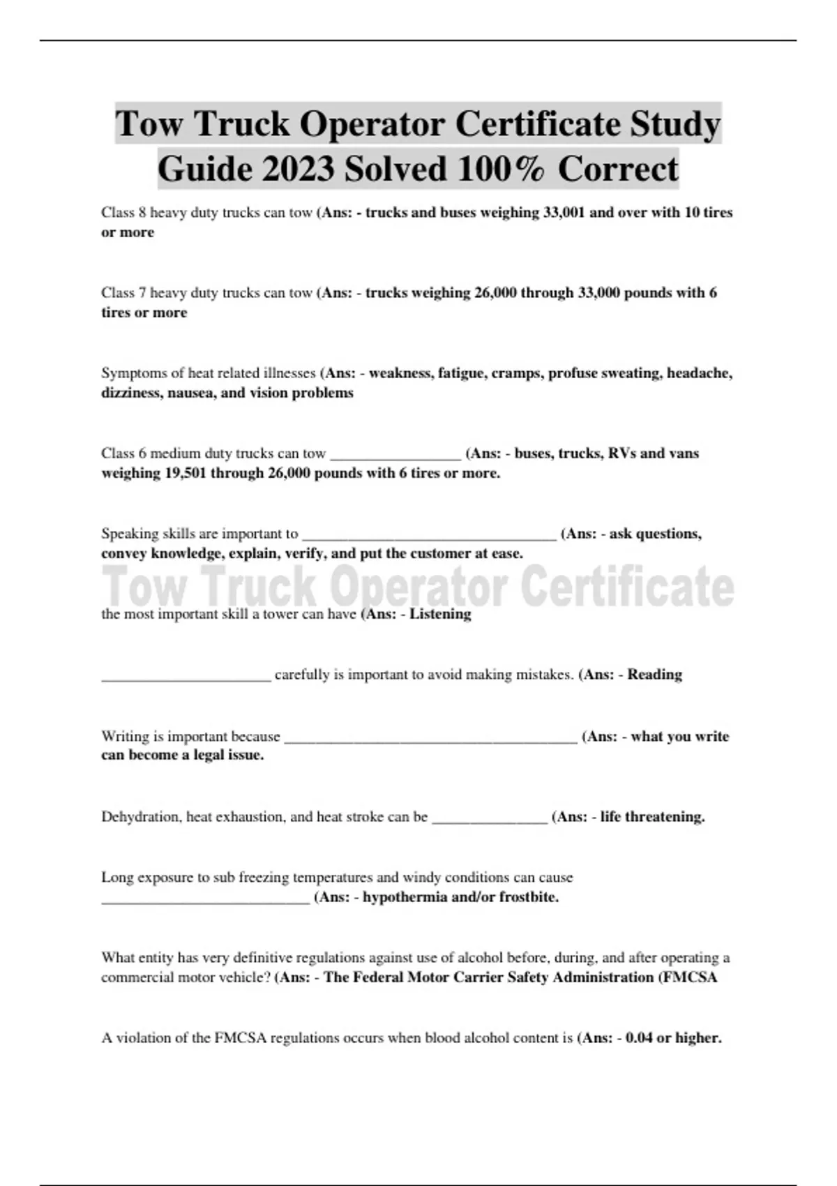 Tow Truck Operator Certificate Study Guide 2023 Solved 100% Correct,Tow Truck Operator Certificate Study Guide 2023 Solved 100% Correct,Tow Truck Operator Certificate Study Guide 2023 Solved 100% Correct