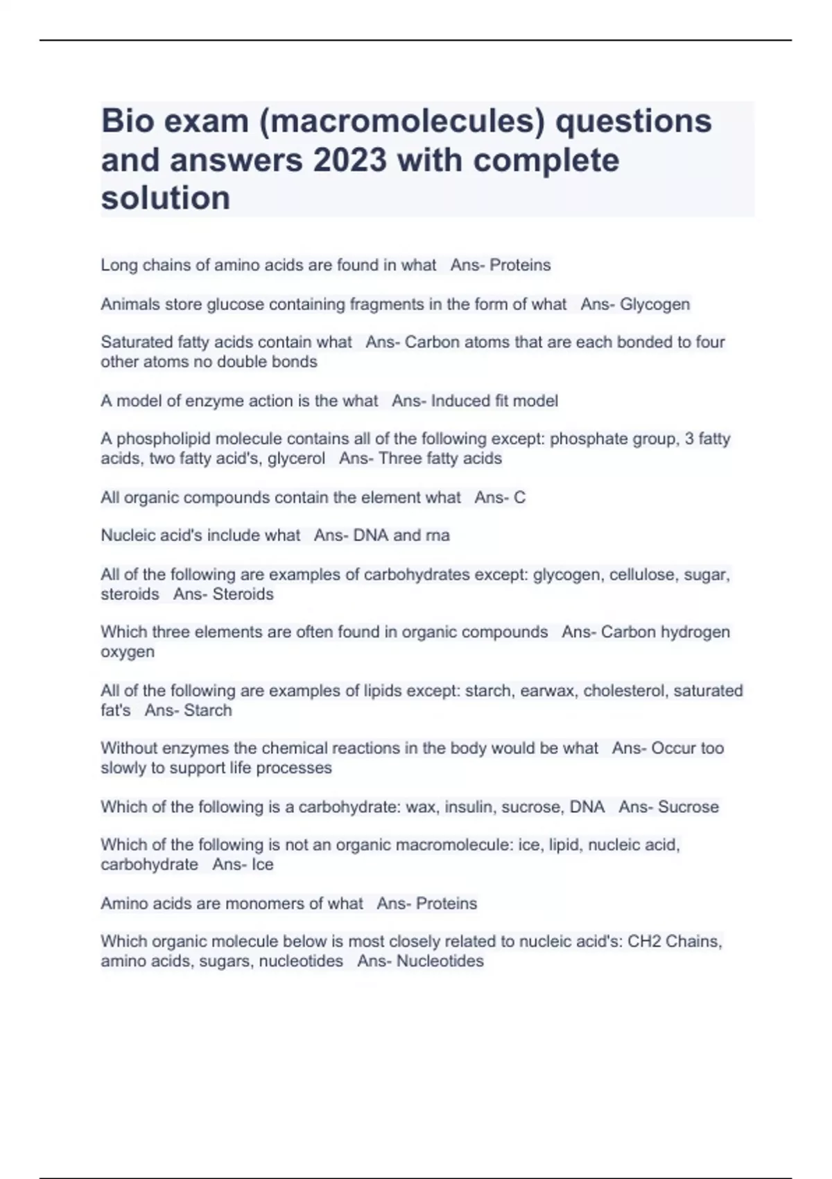 Bio exam (macromolecules) questions and answers 2023 with complete solution