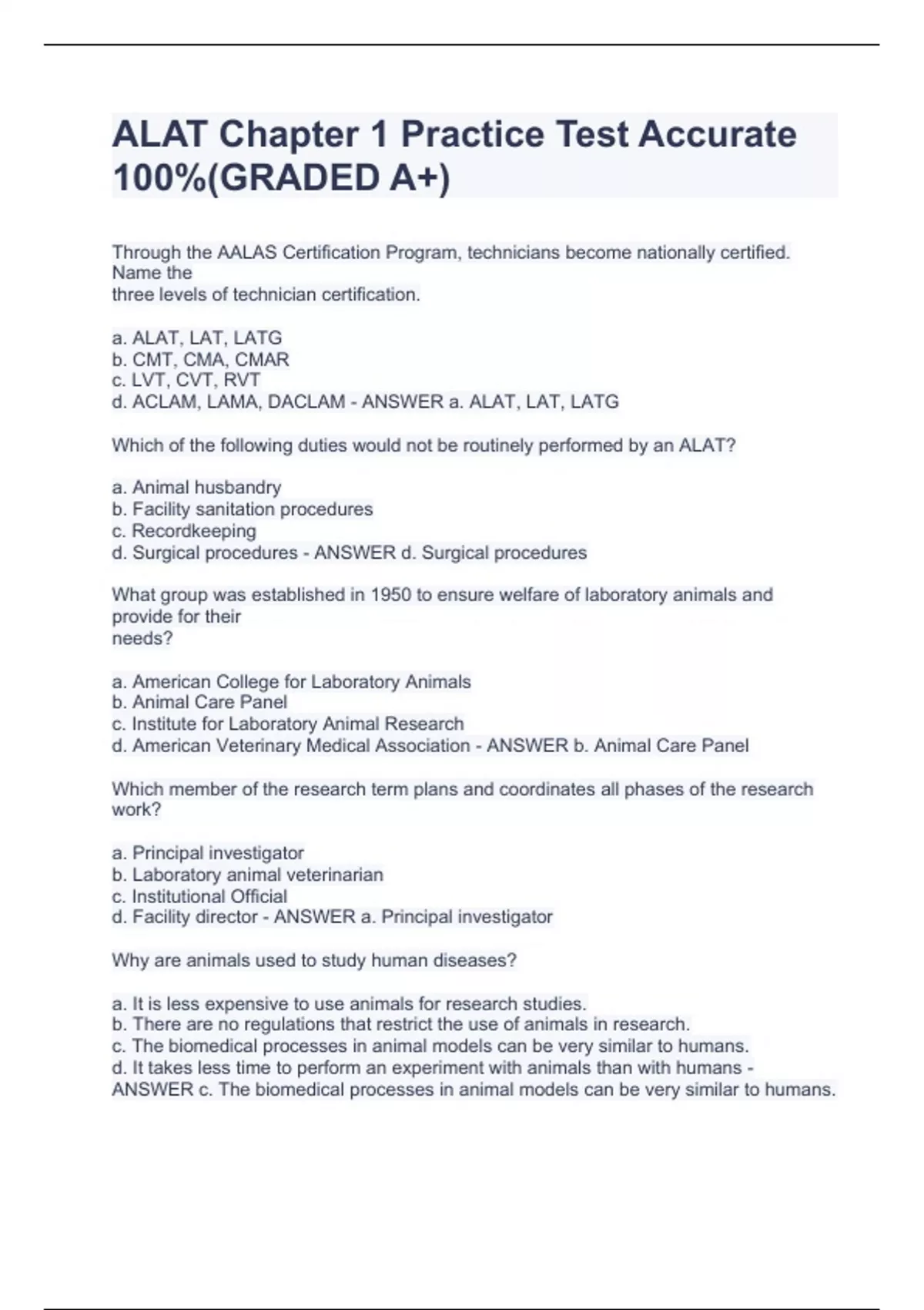 Through the AALAS Certification Program, technicians become nationally certified. Name the three levels of technician certification. a. ALAT, LAT, LATG b. CMT, CMA, CMAR c. LVT, CVT, RVT d. ACLAM, LAMA, DACLAM - ANSWER a. ALAT, LAT, LATG Which of the following duties would not be routinely performed by an ALAT? a. Animal husbandry b. Facility sanitation procedures c. Recordkeeping d. Surgical procedures - ANSWER d. Surgical procedures What group was established in 1950 to ensure welfare of laboratory animals and provide for their needs? a. American College for Laboratory Animals b. Animal Care Panel c. Institute for Laboratory Animal Research ALAT Chapter 1 Practice Test Accurate 100%(GRADED A+)