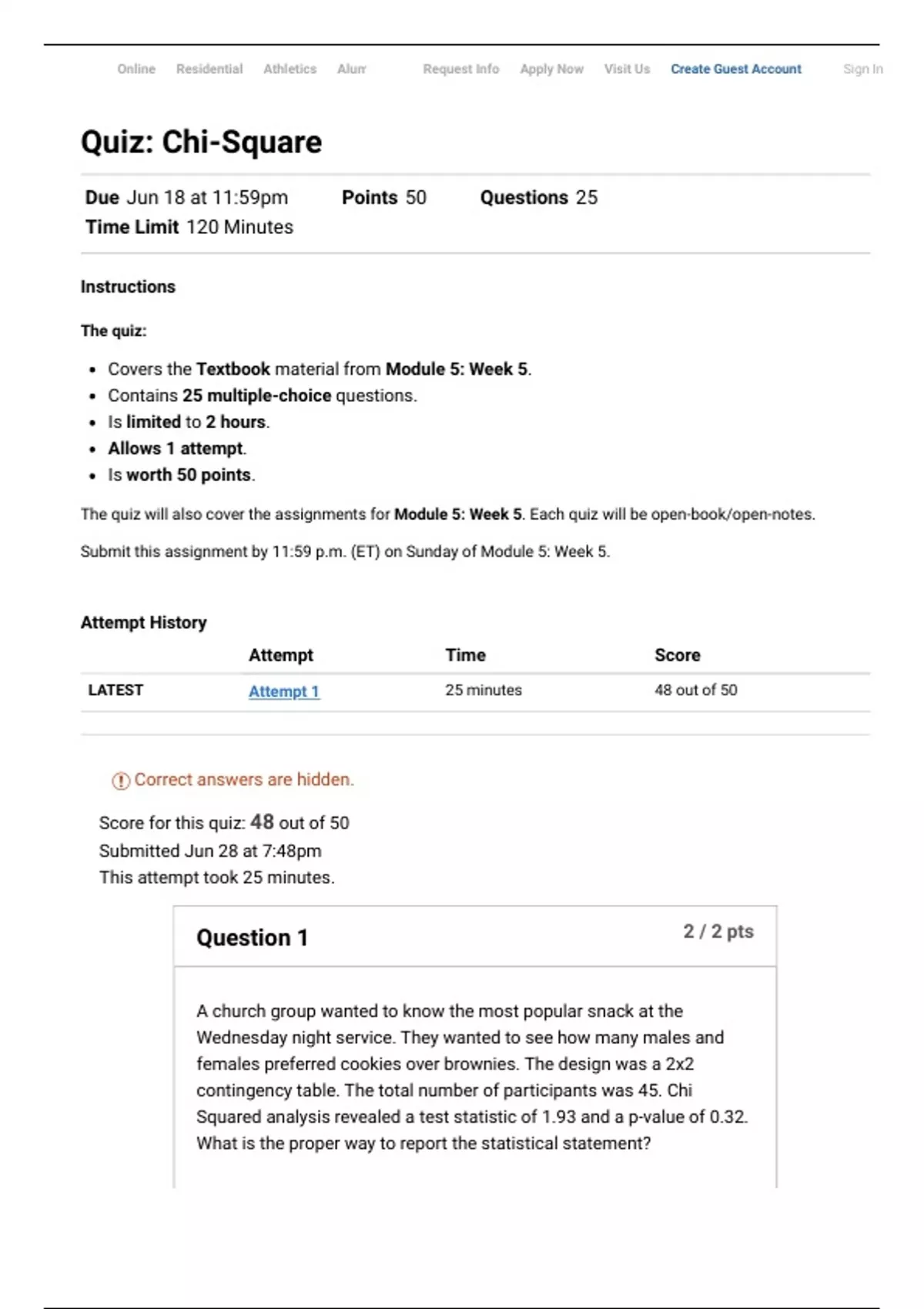 A church group wanted to know the most popular snack at the Wednesday night service. They wanted to see how many males and females preferred cookies over brownies. The design was a 2x2 contingency table. The total number of participants was 45. Chi Squared analysis revealed a test statistic of 1.93 and a p-value of 0.32. What is the proper way to report the statistical statement? Online Residential Athletics Alum Request Info Apply Now Visit Us Create Guest Account Sign In χ2 (4, N = 45) = 1.93, p = .32 χ2 (1, N = 45) = 1.93, p < .05 χ2 (1, N = 45) = 1.93, p = .32 2 / 2 pts Question 2 Nurses at Lynchburg General plan to implement a new training program for nursing aids to deal with stress. To test the effectiveness of the training program, a 2x2 design was used. The nurses reported the following statistical statement: χ2(1, N = 12) = 2.71, p = .62. They concluded that _______. There was no signicant difference There was a significant difference There was a large effect size 2 / 2 pts Question 3 The career center at Liberty University wanted to see which students utilized the job fair. They wanted to see if class level (Freshman or Senior) had an impact on attendance at the job fair (attended or did not attend). What would the degrees of freedom (df) be for this contingency table? 1 2 4 None of the above 2 / 2 pts Question 4 The degrees of freedom (df) for a 2x3 chi square table is _______. 1 2 5 6 2 / 2 pts Question 5 Contingent means “related to” or “predictable from.” True False 2 / 2 pts Question 6 Expected frequency should be not less than 5 for each cell.