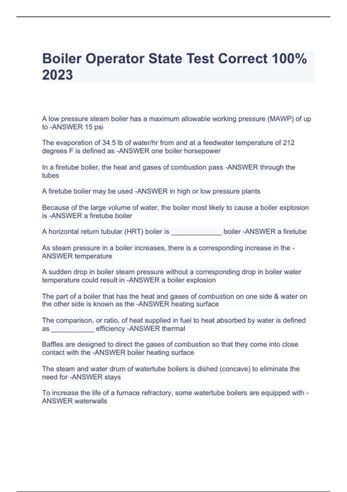 A low pressure steam boiler has a maximum allowable working pressure (MAWP) of up to -ANSWER 15 psi The evaporation of 34.5 lb of water/hr from and at a feedwater temperature of 212 degrees F is defined as -ANSWER one boiler horsepower In a firetube boiler, the heat and gases of combustion pass -ANSWER through the tubes A firetube boiler may be used -ANSWER in high or low pressure plants Because of the large volume of water, the boiler most likely to cause a boiler explosion is -ANSWER a firetube boiler A horizontal return tubular (HRT) boiler is _____________ boiler -ANSWER a firetube As steam pressure in a boiler increases, there is a corresponding increase in the -ANSWER temperature A sudden drop in boiler steam pressure without a corresponding drop in boiler water temperature could result in -ANSWER a boiler explosion The part of a boiler that has the heat and gases of combustion on one side & water on the other side is known as the -ANSWER heating surface The comparison, or ratio, of heat supplied in fuel to heat absorbed by water is defined as ___________ efficiency -ANSWER thermal Baffles are designed to direct the gases of combustion so that they come into close contact with the -ANSWER boiler heating surface The steam and water drum of watertube boilers is dished (concave) to eliminate the need for -ANSWER stays To increase the life of a furnace refractory, some watertube boilers are equipped with -ANSWER waterwalls Vertical firetube boilers require -ANSWER high ceilings, less floor space, & the use of staybolts In a watertube boiler, the heat and gases of combustion pass -ANSWER around the tubes The __________ boiler has a large volume of water in relation to horsepower size -ANSWER firetube Stays and braces are needed to prevent bulging in -ANSWER a firetube boiler (high or low pressure) The ____________ boiler was developed to provide steam at higher pressures -ANSWER watertube Boiler plates and staybolts are subjected to ____________ stress -ANSWER tensile Safety valve connections must be approved by the -ANSWER American Society of Mechanical Engineers (ASME) Boiler fittings are necessary for -ANSWER safety & efficiency The most important fitting on a Boiler Operator State Test Correct 100% 2023