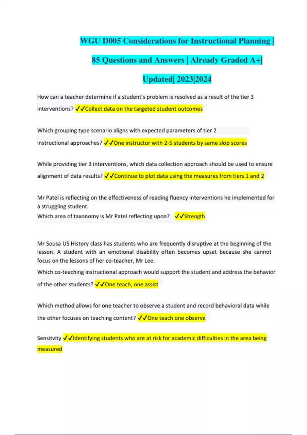 WGU D005 Considerations for Instructional Planning | 85 Questions and Answers | Already Graded A+| Updated| 2023|2024 How can a teacher determine if a student's problem is resolved as a result of the tier 3 interventions? Collect data on the targeted student outcomes Which grouping type scenario aligns with expected parameters of tier 2 instructional approaches? One instructor with 2-5 students by same slop scores While providing tier 3 interventions, which data collection approach should be used to ensure alignment of data results? Continue to plot data using the measures from tiers 1 and 2 Mr Patel is reflecting on the effectiveness of reading fluency interventions he implemented for a struggling student. Which area of taxonomy is Mr Patel reflecting upon? Strength Mr Sousa US History class has students who are frequently disruptive at the beginning of the lesson. A student with an emotional disability often becomes upset because she cannot focus on the lessons of her co-teacher, Mr Lee. Which co-teaching instructional approach would support the student and address the behavior of the other students? One teach, one assist Which method allows for one teacher to observe a student and record behavioral data while the other focuses on teaching content? One teach one observe Sensitvity Identifying students who are at risk for academic difficulties in the area being measured
