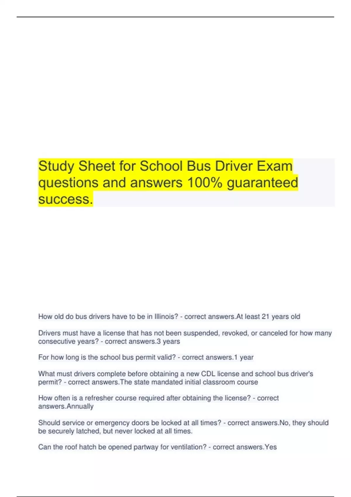 Study Sheet for School Bus Driver Exam questions and answers 100% guaranteed success.