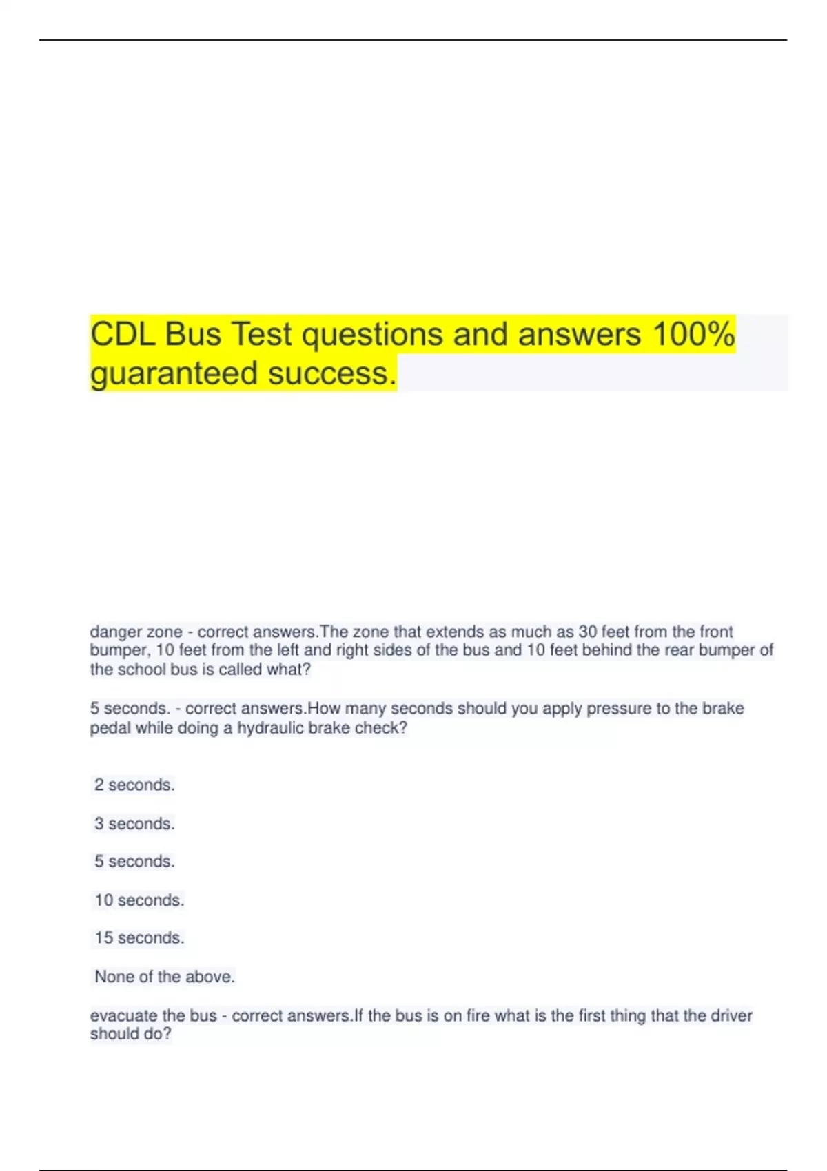 CDL Bus Test questions and answers 100% guaranteed success. danger zone - correct answers.The zone that extends as much as 30 feet from the front bumper, 10 feet from the left and right sides of the bus and 10 feet behind the rear bumper of the school bus is called what? 5 seconds. - correct answers.How many seconds should you apply pressure to the brake pedal while doing a hydraulic brake check? 2 seconds. 3 seconds. 5 seconds. 10 seconds. 15 seconds. None of the above. evacuate the bus - correct answers.If the bus is on fire what is the first thing that the driver should do? Far enough in front of the school bus to be in your view. - correct answers.What position should students be in when in front of the bus before they cross the roadway? Far enough in front of the school bus to be in your view. 15 feet in front of the school bus. 25 feet in front of the school bus. 35 feet in front of the school bus. Students should never cross the roadway in front of the bus. true - correct answers.More students are killed while getting on or off a school bus each year than are killed as passengers inside of a school bus. true/false Brake the same way, regardless of whether you have ABS on the bus. - correct answers.How should you use your brakes if your vehicle is equipped with anti-lock brakes? Brake the same way, regardless of whether you have ABS on the bus. Pump the brakes evenly. Brake earlier than you normally would. Release the anti-lock valve then push the brake firmly. True - correct answers.After unloading at school, you should walk through the bus and check for sleeping students, open windows and doors, and check any mechanical or operational problems with the bus. true/false TRUE - correct answers.The blind spot behind the bus extends 50 to 150 feet and could extend up to 400 feet depending on the length and width of the bus. true/false The area anywhere outside of the bus where children are in the most danger of being hit, either by another vehicle or their own bus. - correct answers.Which of the following best describes the danger zone of a school bus? The area on the right side of the bus not visible by any of your mirrors. The area behind the bus while picking up students. The area inside the bus where there are no seats while the bus is moving. The area anywhere outside of the bus where children are in the most danger of being hit, either by another vehicle or their own bus. None of the above. Overhead rearview mirror - correct answers.What mirror is used to monitor passenger activity inside the bus? Side crossover mirrors. Side flat mirrors. Overhead rearview mirror. Side convex mirrors. False - correct answers.When approaching a railroad crossing you should stop no closer than 5 feet and no farther than 25 feet from the nearest rail, where you have the best view of the tracks. false - correct answers.A school bus has special right-of-way privileges on all highways. true/false FALSE - correct answers.It is ok to use the stop arm if the flashing red warning lights were not used. true/false all of the above - correct answers.Under what conditions must you evacuate the bus? All of the above - correct answers.What additional things do school bus drivers need to check during a pre-trip inspection? *Check the stop arm control. *Check the operation of the emergency door and buzzer. *Check that the first aid kit is properly equipped. *Check the red flashers and the strobe light if the bus is equipped with one. *All of the above. *None of the above. Evacuate the bus - correct answers.If the bus is on fire what is the first thing that the driver should do? *Grab the fire extinguisher and attempt to put out the fire. *Evacuate the bus. *Write down the location, time, and mileage on the bus log. *Conduct an investigation. true - correct answers.You will NOT need to crawl under the school bus during a pre-trip inspection. True/False This type of crossing does not have any type of traffic control device. - correct answers.What is a passive highway rail crossing? *This type of crossing does have a traffic control device. *This type of crossing does not have any type of traffic control device. *This type of crossing has a lane to pass slow moving vehicles. *This type of crossing has a swing-arm traffic control device only. *None of the above. This type of crossing does not have any type of traffic control device and the decision to proceed rests entirely in your hands. - correct answers.Why should you be extra cautious at a passive crossing? *This type of crossing has a passing lane and you need to be alert for passing vehicles. *This type of crossing does not have any type of traffic control device and the decision to proceed rests entirely in your hands. *This type of crossing is used for crossing high speed train tracks. *None of the above. A Passive Crossing - correct answers.Which type of rail crossing does not have any type of traffic control device? *An Open Crossing. *A Danger Crossing. *A Passive Crossing. *A Free Crossing. If the school bus is so equipped, activate alternating flashing amber warning lamps before the school bus stop in accordance with state law. - correct answers.You are loading students along the route. When should you activate your alternating flashing amber warning lamps? *These lights are always flashing when the bus is running. *Never activate these lights unless there is an emergency. *2000 meters before you stop the school bus. *If the school bus is so equipped, activate alternating flashing amber warning lamps before the school bus stop in accordance with state law. The driver - correct answers.Students with special needs should be seated near? *An emergency exit. *The back of the school bus. *The driver. *None of the above. After receiving a hand signal from the bus driver. - correct answers.How do the students that live on the left side of the street know when it is safe to cross the street when being dropped off? *After waiting 10 seconds it is safe to cross. 