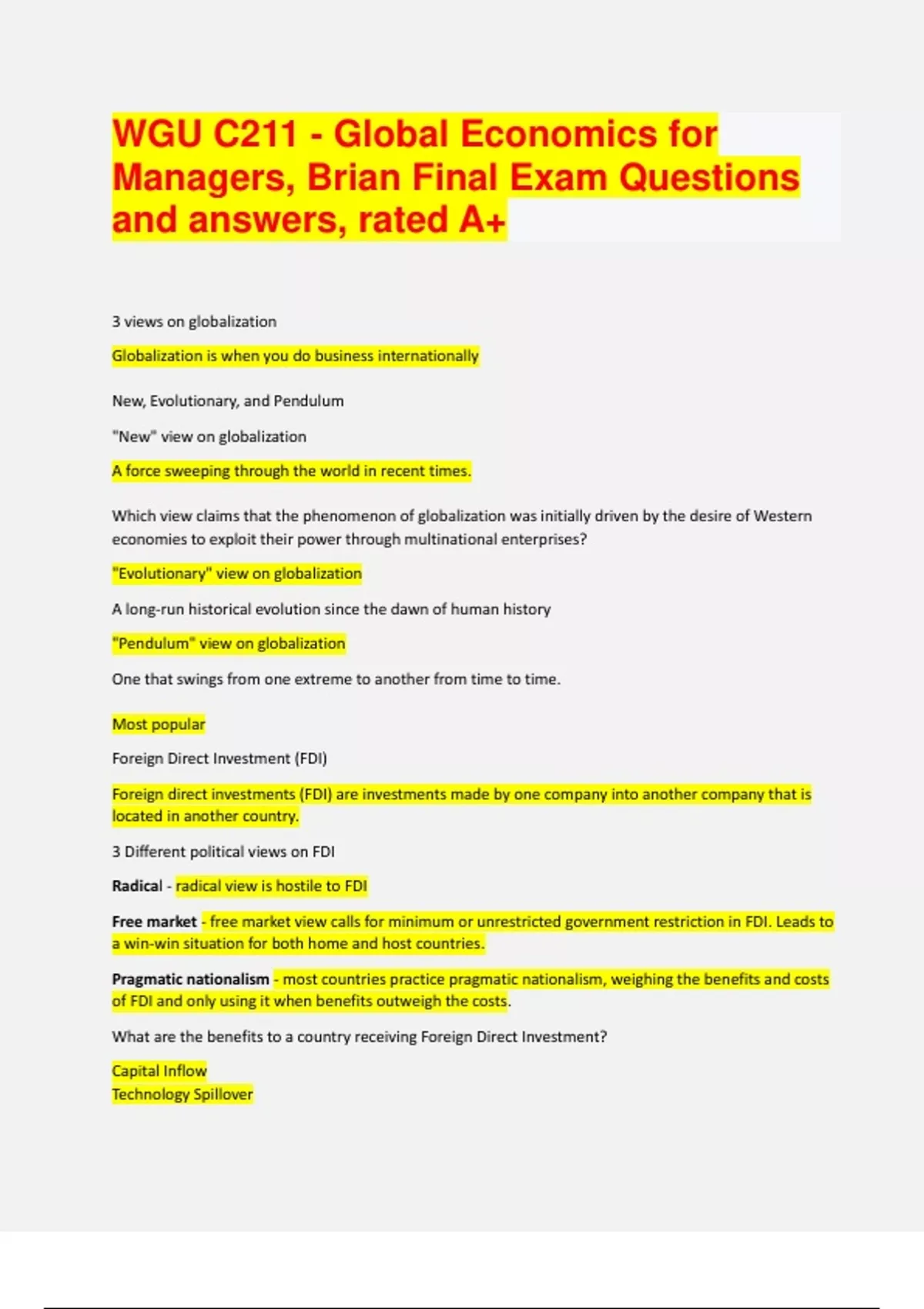 WGU C211 - Global Economics for Managers, Brian Final Exam Questions and answers, rated A+ 2024 | 44 Pages