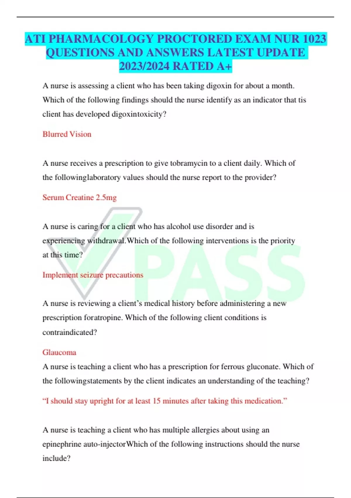 ATI PHARMACOLOGY PROCTORED EXAM NUR 1023 QUESTIONS AND ANSWERS LATEST UPDATE 2023/2024 RATED A+ A nurse is assessing a client who has been taking digoxin for about a month. Which of the following findings should the nurse identify as an indicator that tis client has developed digoxintoxicity? Blurred Vision A nurse receives a prescription to give tobramycin to a client daily. Which of the followinglaboratory values should the nurse report to the provider? Serum Creatine 2.5mg A nurse is caring for a client who has alcohol use disorder and is experiencing withdrawal.Which of the following interventions is the priority at this time?