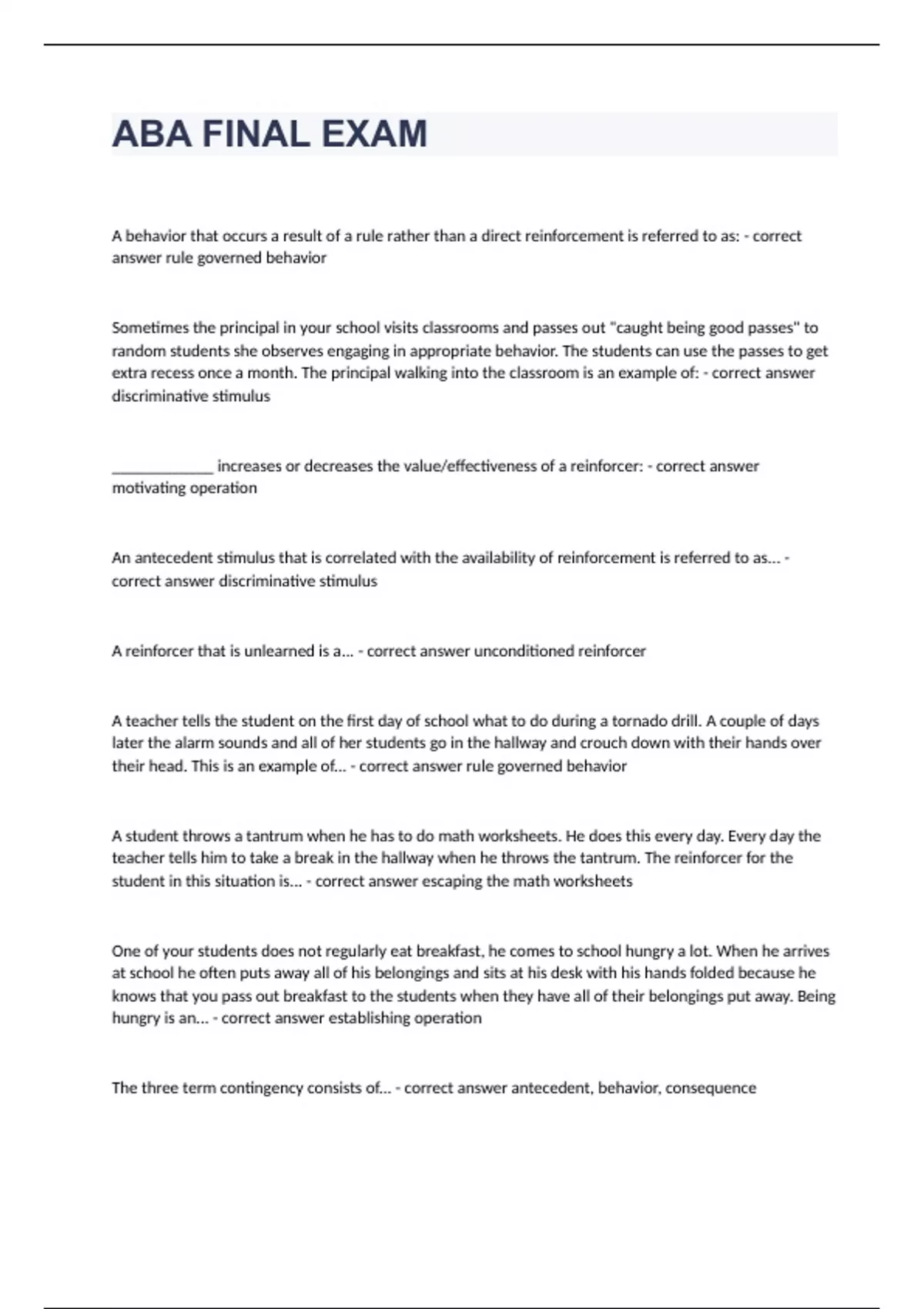 ABA FINAL EXAM A behavior that occurs a result of a rule rather than a direct reinforcement is referred to as: - correct answer rule governed behavior Sometimes the principal in your school visits classrooms and passes out "caught being good passes" to random students she observes engaging in appropriate behavior. The students can use the passes to get extra recess once a month. The principal walking into the classroom is an example of: - correct answer discriminative stimulus ____________ increases or decreases the value/effectiveness of a reinforcer: - correct answer motivating operation An antecedent stimulus that is correlated with the availability of reinforcement is referred to as... - correct answer discriminative stimulus A reinforcer that is unlearned is a... - correct answer unconditioned reinforcer A teacher tells the student on the first day of school what to do during a tornado drill. A couple of days later the alarm sounds and all of her students go in the hallway and crouch down with their hands over their head. This is an example of... - correct answer rule governed behavior A student throws a tantrum when he has to do math worksheets. He does this every day. Every day the teacher tells him to take a break in the hallway when he throws the tantrum. The reinforcer for the student in this situation is... - correct answer escaping the math worksheets One of your students does not regularly eat breakfast, he comes to school hungry a lot. When he arrives at school he often puts away all of his belongings and sits at his desk with his hands folded because he knows that you pass out breakfast to the students when they have all of their belongings put away. Being hungry is an... - correct answer establishing operation The three term contingency consists of... - correct answer antecedent, behavior, consequence An antecedent stimulus that is correlated with the availability of reinforcement is referred to as... - correct answer discriminative stimulus Ms. Carson shows Daniel a flash card with the word "car" on it. She says, "what word? Car." Daniel repeats the word and receives praise. Ms.Carson then provides Daniel with three seconds to respond before providing him with the correct answer. This prompting procedure is called: - correct answer time delay Mr. Nader has been teaching Marsha to wash her hands. Marsha is able to do most of the steps (pump the soap, rub her hands together, dry her hands), but needs help with turning on the water, rinsing her hands, and tearing off a paper towel. Mr Nader prompts Marsha to wash her hands, lets her do all of the steps she can do on her own, and provide assistance only when she needs it. Which prompting procedure is Mr. Nader using? - correct answer graduated guidance Mrs. Browning is using the following prompting procedure to teach Jamie to write the first letter of his name. After she hands Jamie the pencil, she puts her hand over his hand and moves it to form the letter J. Then she tells him to write the letter J verbally (without physical assistance). What prompting procedure is Mrs. Browning using? - correct answer most to least Laurie is going to a party, but she's driving around lost. She stops and takes out her GPS navigator and uses it to find the address. Being lost is a ______________. - correct answer motivating operation Alex spits on his worksheets when is assigned a challenging academic task. When he spits on his work during math class, his teacher lets him escape the task. When he spits on his work during reading, his teacher does not let him escape the task. Alex has stopped spitting on his work in reading class. Alex's reading teacher has become a __________ for Alex's spitting behavior. - correct answer stimulus delta Walking through the Short North, you notice a homeless person seeking food as he is really hungry. He is begging for food and looking in the trashcans. You decide to buy him some food from a local restaurant to take him. This behavior of searching for food and begging other for food immediately decreased. The effect on the homeless person after you gave him the food exemplifies? - correct answer an abolishing operation Which of the following is not an unconditioned motivating operation? - correct answer shortage of money