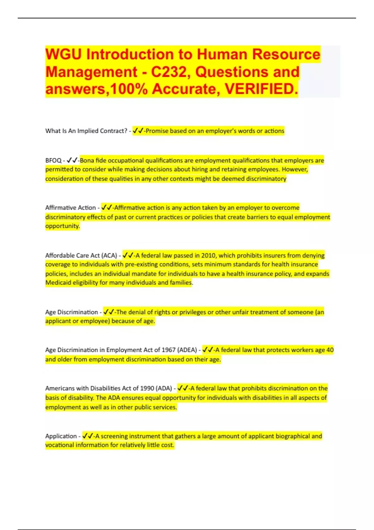 WGU Introduction to Human Resource Management - C232, Questions and answers,100% Accurate, VERIFIED 2024 | 24 Pages