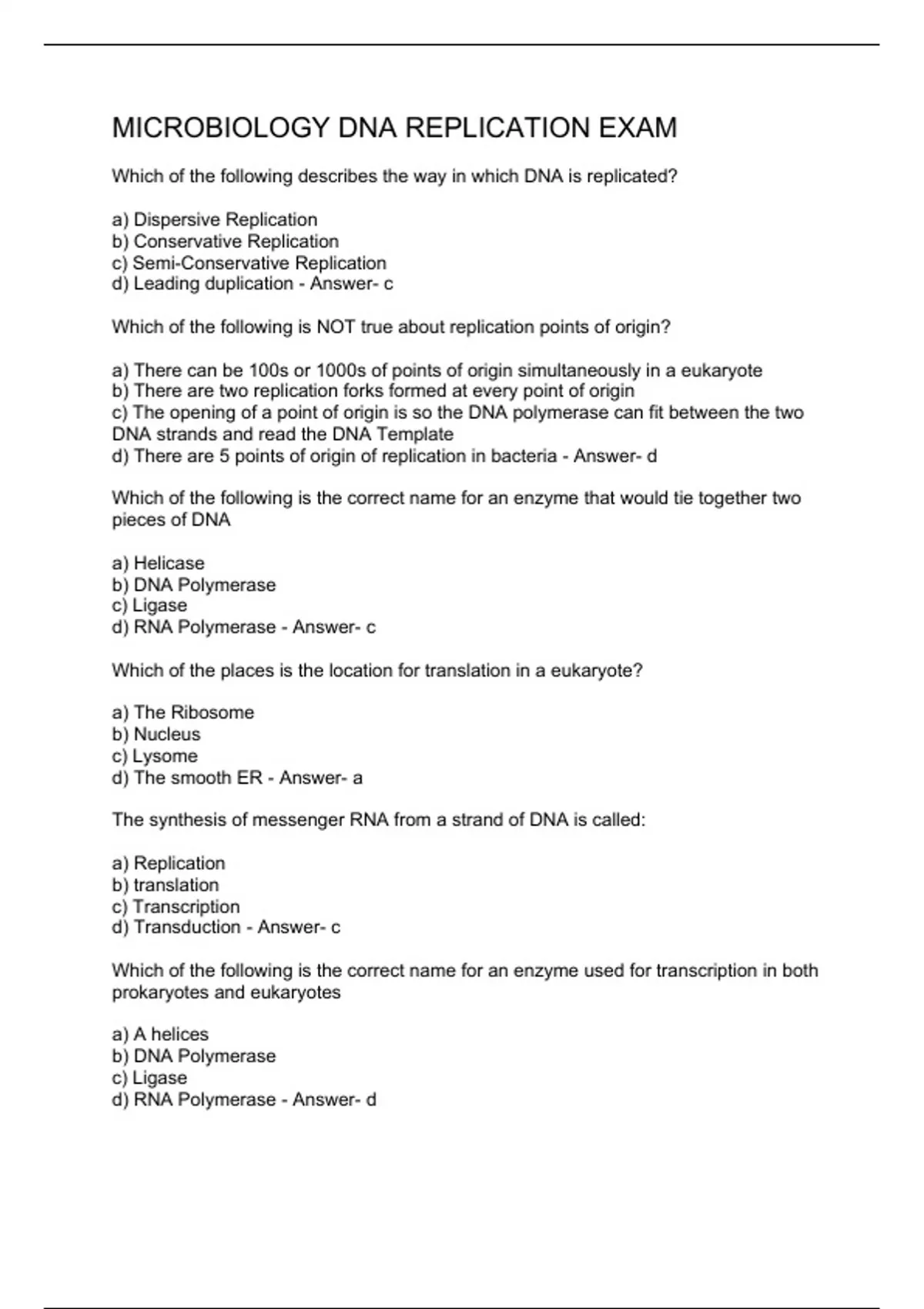 Which of the following describes the way in which DNA is replicated? a) Dispersive Replication b) Conservative Replication c) Semi-Conservative Replication d) Leading duplication - Answer- c Which of the following is NOT true about replication points of origin? a) There can be 100s or 1000s of points of origin simultaneously in a eukaryote b) There are two replication forks formed at every point of origin c) The opening of a point of origin is so the DNA polymerase can fit between the two DNA strands and read the DNA Template d) There are 5 points of origin of replication in bacteria - Answer- d Which of the following is the correct name for an enzyme that would tie together two pieces of DNA a) Helicase b) DNA Polymerase c) Ligase d) RNA Polymerase - Answer- c Which of the places is the location for translation in a eukaryote? a) The Ribosome b) Nucleus c) Lysome d) The smooth ER - Answer- a The synthesis of messenger RNA from a strand of DNA is called: a) Replication b) translation c) Transcription d) Transduction - Answer- c Wh