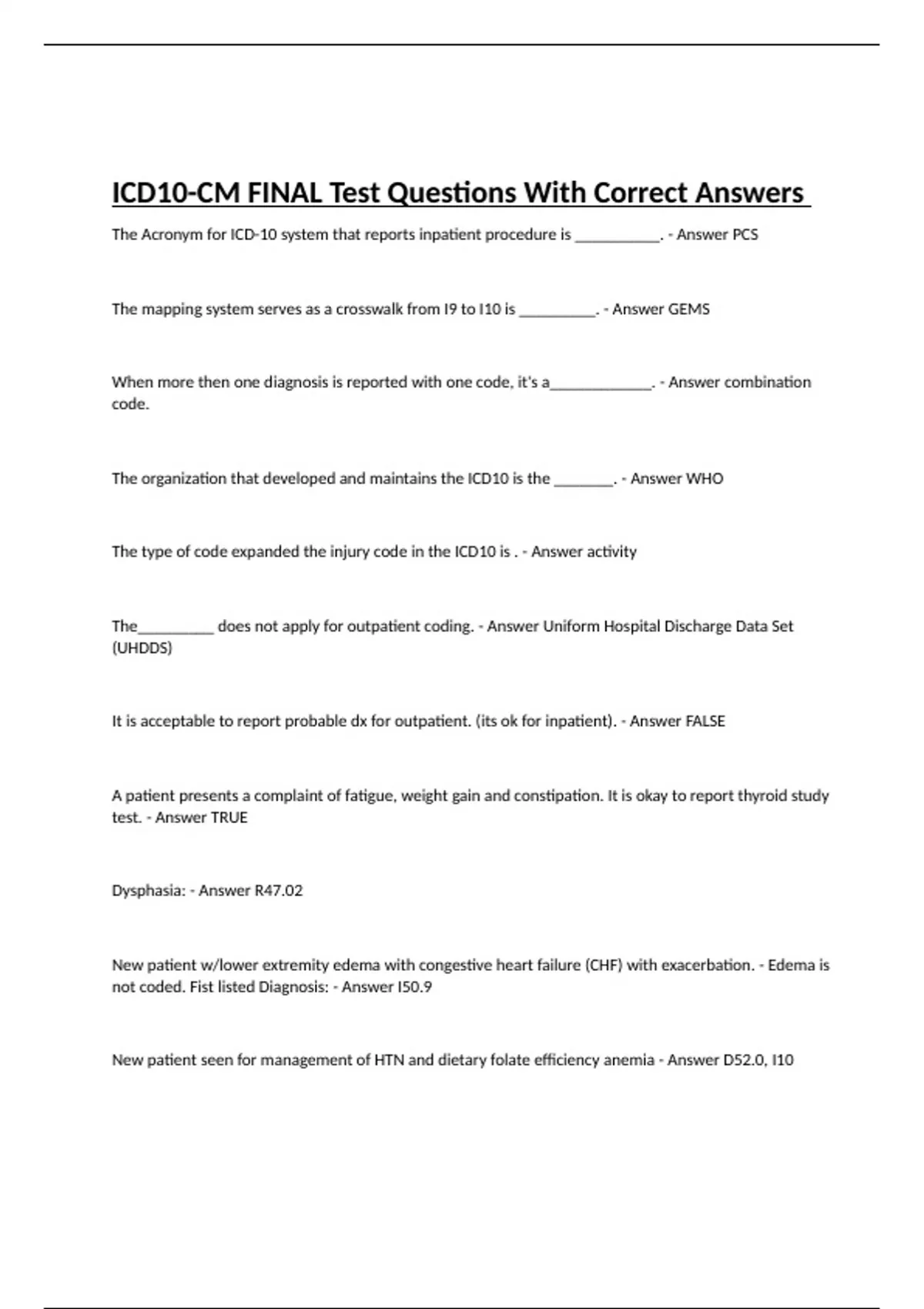 The Acronym for ICD-10 system that reports inpatient procedure is __________. - Answer PCS The mapping system serves as a crosswalk from I9 to I10 is _________. - Answer GEMS When more then one diagnosis is reported with one code, it's a____________. - Answer combination code. The organization that developed and maintains the ICD10 is the _______. - Answer WHO The type of code expanded the injury code in the ICD10 is . - Answer activity The_________ does not apply for outpatient coding. - Answer Uniform Hospital Discharge Data Set (UHDDS) It is acceptable to report probable dx for outpatient. (its ok for inpatient). - Answer FALSE A patient presents a complaint of fatigue, weight gain and constipation. It is okay to report thyroid study test. - Answer TRUE Dysphasia: - Answer R47.02 New patient w/lower extremity edema with congestive heart failure (CHF) with exacerbation. - Edema is not coded. Fist listed Diagnosis: - Answer I50.9 New patient seen for management of HTN and dietary folate efficiency anemia - Answer D52.0, I10 Removing loose body in the right knee - Answer M23.41 A pre-op exam for a RT carotid stenosis (single) and emphysema. - Answer Z01.110, I65.21, J43.9 1 undergone Outpatient cystoscopy the. pre-op for hematuria for Bladder cancer. Code DX ONLY. First listed: bladder cancer w/hematuria or due to hematuria - Answer Z67.9 Exposure to lead - Answer Z77.011 Personal history of benign Neo of the brain. - Answer Z86.011 Kidney transplant status - Answer Z94.0 when a separate dx exist acute or chronic both are documented but acute is sequenced first. - Answer TRUE It is acceptable only to code just in the index. - Answer FALSE When sequencing codes for residual, the residual is sequenced second preceded by a late effect code. residual is coded. - Answer FALSE When there is 7 character available for assignment, you must code all 7 characters. - Answer TRUE The official guidelines of coding and reporting even when a definitive Dx is stated, should we code symptoms? - Answer FALSE A ______________ is a single code used to classify use to classify 2 DX, DX associated w/secondary process (manifestation) and DX associated w/a complication - Answer Combination code Code if applicable any causal condition first "note" indicates that this code maybe assigned as first listed DX when the ____________? - Answer causal condition is unknown or not applicable the 7th character if we have to assign it and we only have 5 characters in assigning a code the 6th place would be a _____________. - Answer placeholder X The word ____________ is an instructional note in the tabular list and it directs us regarding sequencing. - Answer "code first" MEDICAL RECORD: residual FB in the femur due to fall from a ladder into a metal fixture embedded in the bone Residual is______________ and cause is _________________. - Answer FB of the femur fall from ladder