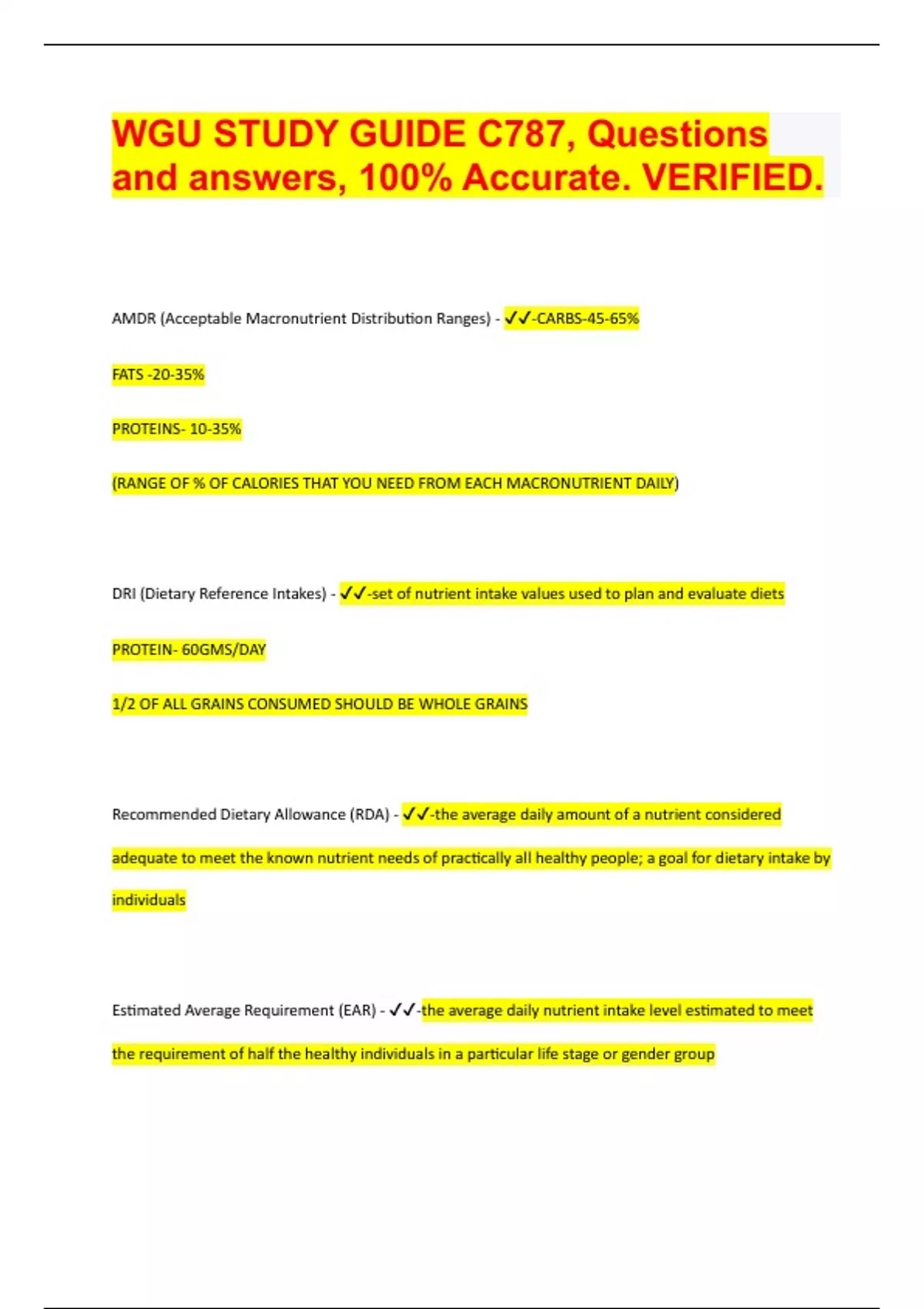 AMDR (Acceptable Macronutrient Distribution Ranges) - -CARBS-45-65% FATS -20-35% PROTEINS- 10-35% (RANGE OF % OF CALORIES THAT YOU NEED FROM EACH MACRONUTRIENT DAILY) DRI (Dietary Reference Intakes) - -set of nutrient intake values used to plan and evaluate diets PROTEIN- 60GMS/DAY 1/2 OF ALL GRAINS CONSUMED SHOULD BE WHOLE GRAINS Recommended Dietary Allowance (RDA) - -the average daily amount of a nutrient considered adequate to meet the known nutrient needs of practically all healthy people; a goal for dietary intake by individuals Estimated Average Requirement (EAR)