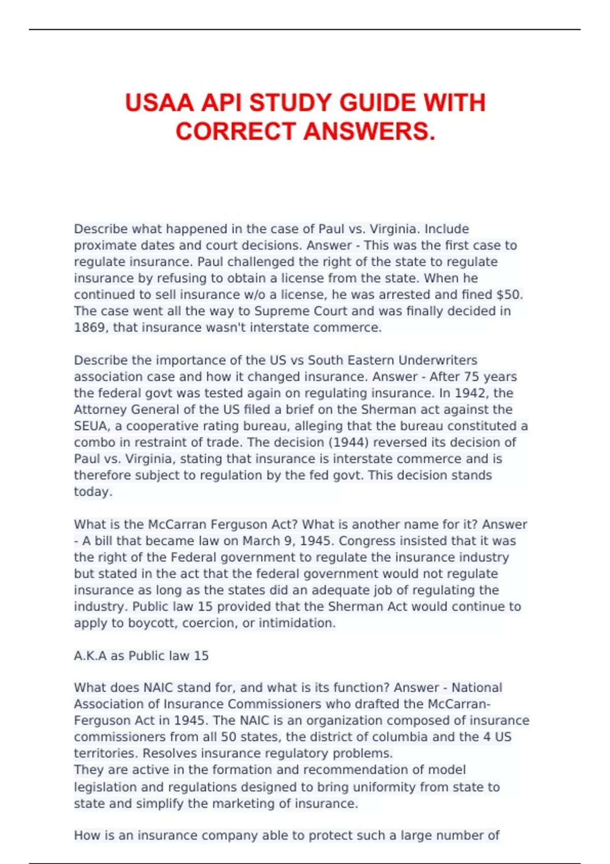 USAA API STUDY GUIDE WITH CORRECT ANSWERS Describe what happened in the case of Paul vs. Virginia. Include proximate dates and court decisions. Answer - This was the first case to regulate insurance. Paul challenged the right of the state to regulate insurance by refusing to obtain a license from the state. When he continued to sell insurance w/o a license, he was arrested and fined $50. The case went all the way to Supreme Court and was finally decided in 1869, that insurance wasn't interstate commerce.