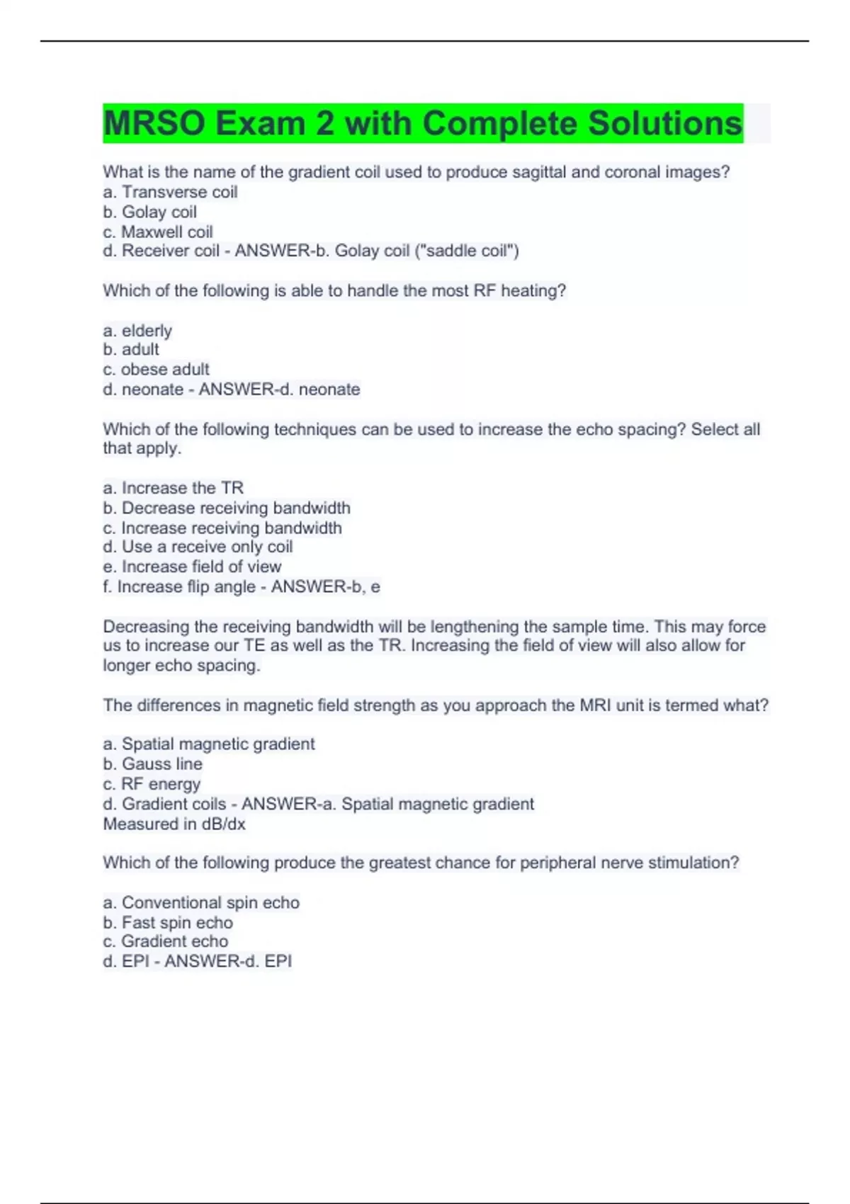 What is the name of the gradient coil used to produce sagittal and coronal images? a. Transverse coil b. Golay coil c. Maxwell coil d. Receiver coil - ANSWER-b. Golay coil ("saddle coil") Which of the following is able to handle the most RF heating? a. elderly b. adult c. obese adult d. neonate - ANSWER-d. neonate Which of the following techniques can be used to increase the echo spacing? Select all that apply. a. Increase the TR b. Decrease receiving bandwidth c. Increase receiving bandwidth d. Use a receive only coil e. Increase field of view f. Increase flip angle - ANSWER-b, e Decreasing the receiving bandwidth will be lengthening the sample time. This may force us to increase our TE as well as the TR. Increasing the field of view will also allow for longer echo spacing. The differences in magnetic field strength as you approach the MRI unit is termed what? a. Spatial magnetic gradient b. Gauss line c. RF energy d. Gradient coils - ANSWER-a. Spatial magnetic gradient Measured in dB/dx Which of the following produce the greatest chance for peripheral nerve stimulation? a. Conventional spin echo b. Fast spin echo c. Gradient echo d. EPI - ANSWER-d. EPI