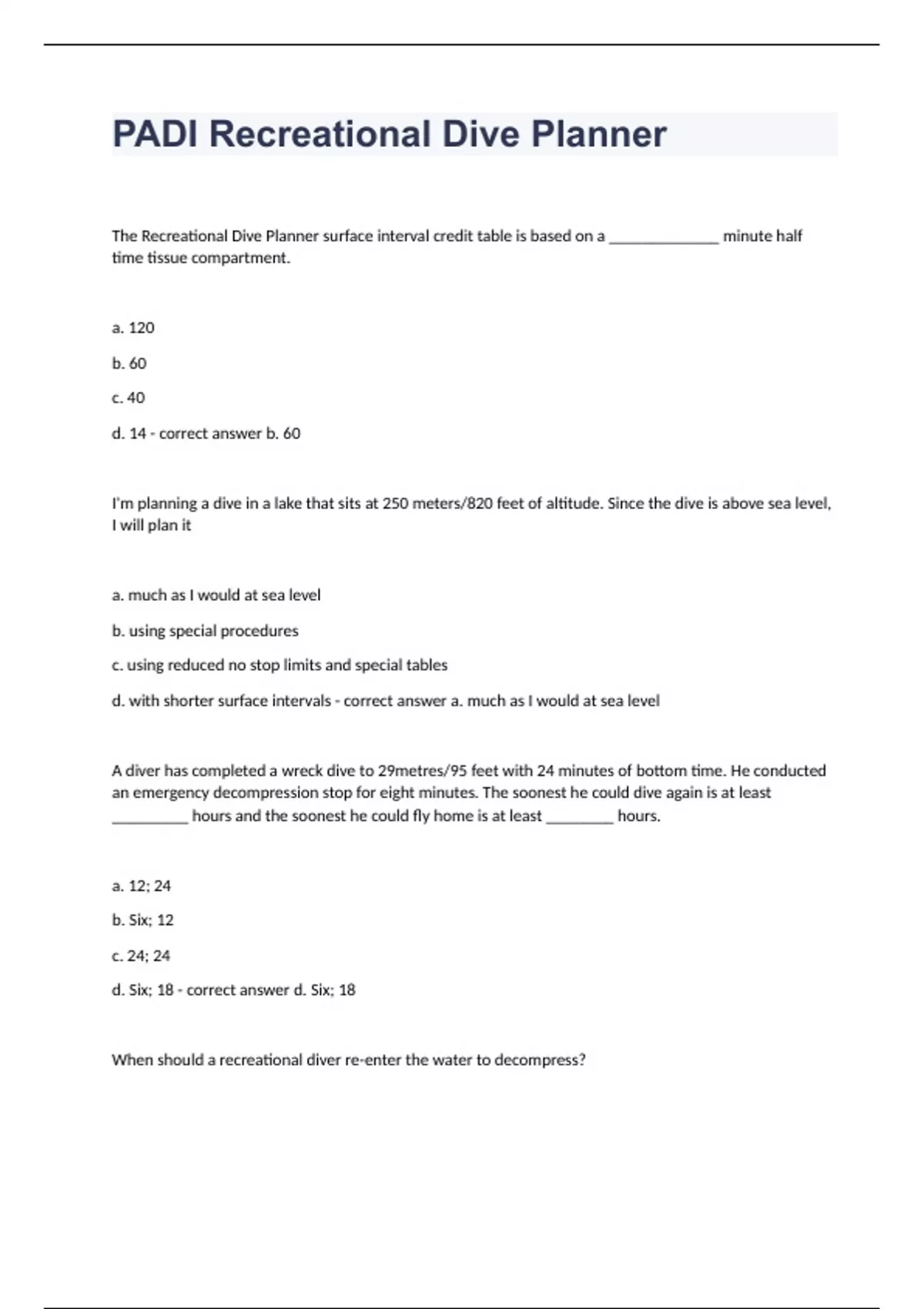 PADI Recreational Dive PlannerThe Recreational Dive Planner surface interval credit table is based on a _____________ minute half time tissue compartment. a. 120 b. 60 c. 40 d. 14 - correct answer b. 60 I'm planning a dive in a lake that sits at 250 meters/820 feet of altitude. Since the dive is above sea level, I will plan it a. much as I would at sea level b. using special procedures c. using reduced no stop limits and special tables d. with shorter surface intervals - correct answer a. much as I would at sea level A diver has completed a wreck dive to 29metres/95 feet with 24 minutes of bottom time. He conducted an emergency decompression stop for eight minutes. The soonest he could dive again is at least _________ hours and the soonest he could fly home is at least ________ hours. a. 12; 24 b. Six; 12 c. 24; 24 d. Six; 18 - correct answer d. Six; 18 When should a recreational diver re-enter the water to decompress? a. If a no decompression limit is exceeded by no more than five minutes and the emergency decompression stop was missed. b. If a no decompression limit is exceeded by more than five minutes and the emergency decompression stop was missed. c. If the diver made a very fast ascent with no stops. d. Never - correct answer d. Never The special rule for multiple repetitive dives (WXYZ rule) was developed to a. account for extended no-decompression bottom times at shallower depths. b. account for the possibility of overexertion. c. account for reverse profile typically taken be recreational divers. d. account for multi-level diving within a single dive. - correct answer a. account for extended no-decompression bottom times at shallower depths. The RDP was developed using a ____________ model because ____________. a. multi-tissue; this approach encompasses both decompression and no-decompression dives b. multi-tissue; body tissues on-gas and off-gas nitrogen at various rates c. single-tissue; there can only be one controlling tissue d. single-tissue; calculations are less complex and more accurate - correct answer b. multi-tissue; body tissues on-gas and off-gas nitrogen at various rates What is the no decompression limit for a dive to 11 meters/36 feet? Metric Imperial a. 98 minutes a. 80 minutes b. 135 minutes b. 135 minutes c. 147 minutes c. 140 minutes d. 219 minutes d. 205 minutes - correct answer c. 147 minutes c. 140 minutes