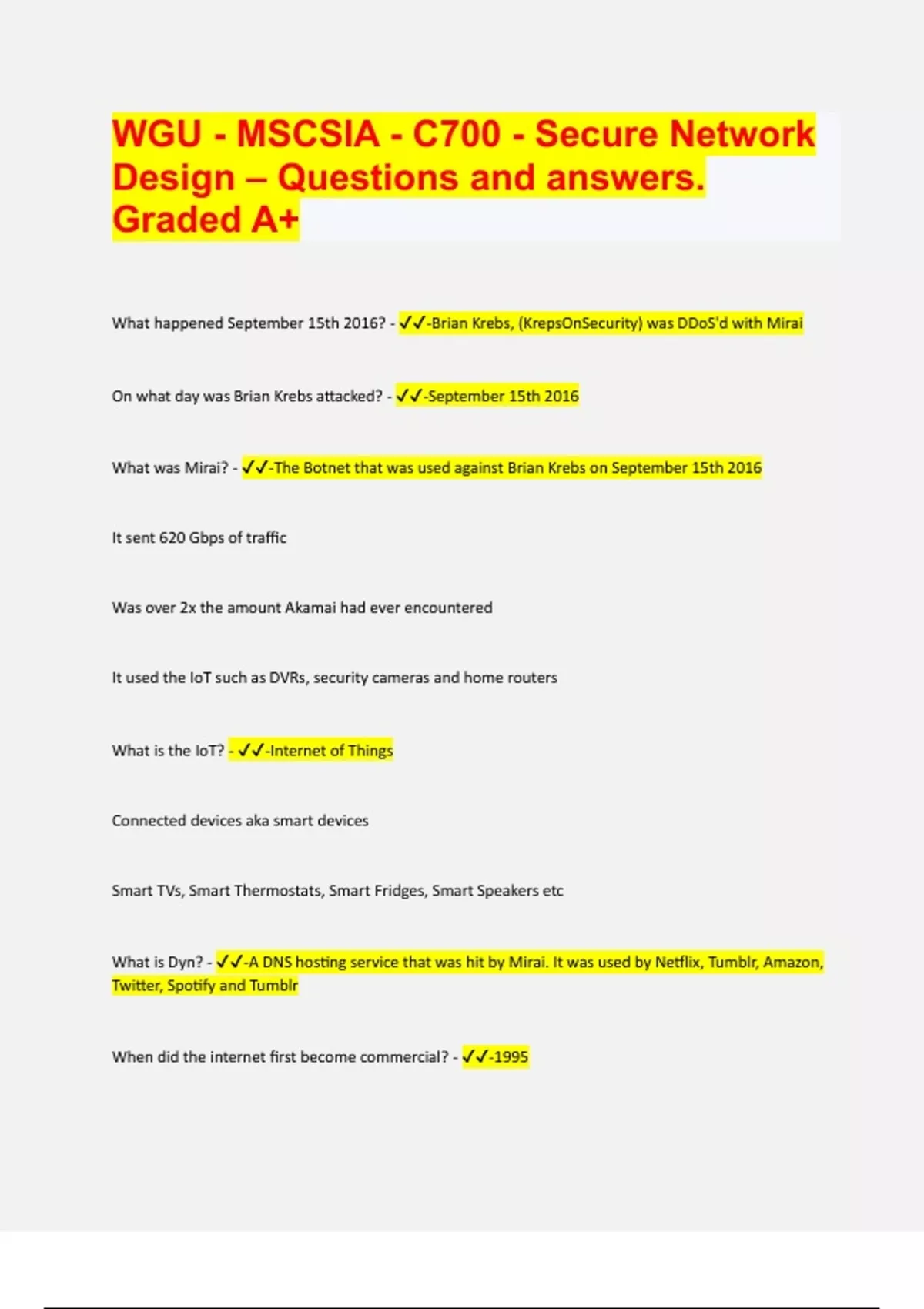 What happened September 15th 2016? - -Brian Krebs, (KrepsOnSecurity) was DDoS'd with Mirai On what day was Brian Krebs attacked? - -September 15th 2016 What was Mirai? - -The Botnet that was used against Brian Krebs on September 15th 2016 It sent 620 Gbps of traffic Was over 2x the amount Akamai had ever encountered It used the IoT such as DVRs, security cameras and home routers What is the IoT? - -Internet of Things Connected devices aka smart devices Smart TVs, Smart Thermostats, Smart Fridges, Smart Speakers etc What is Dyn? - -A DNS hosting service that was hit by Mirai. It was used by Netflix, Tumblr, Amazon, Twitter, Spotify and Tumblr When did the internet first become commercial? - -1995