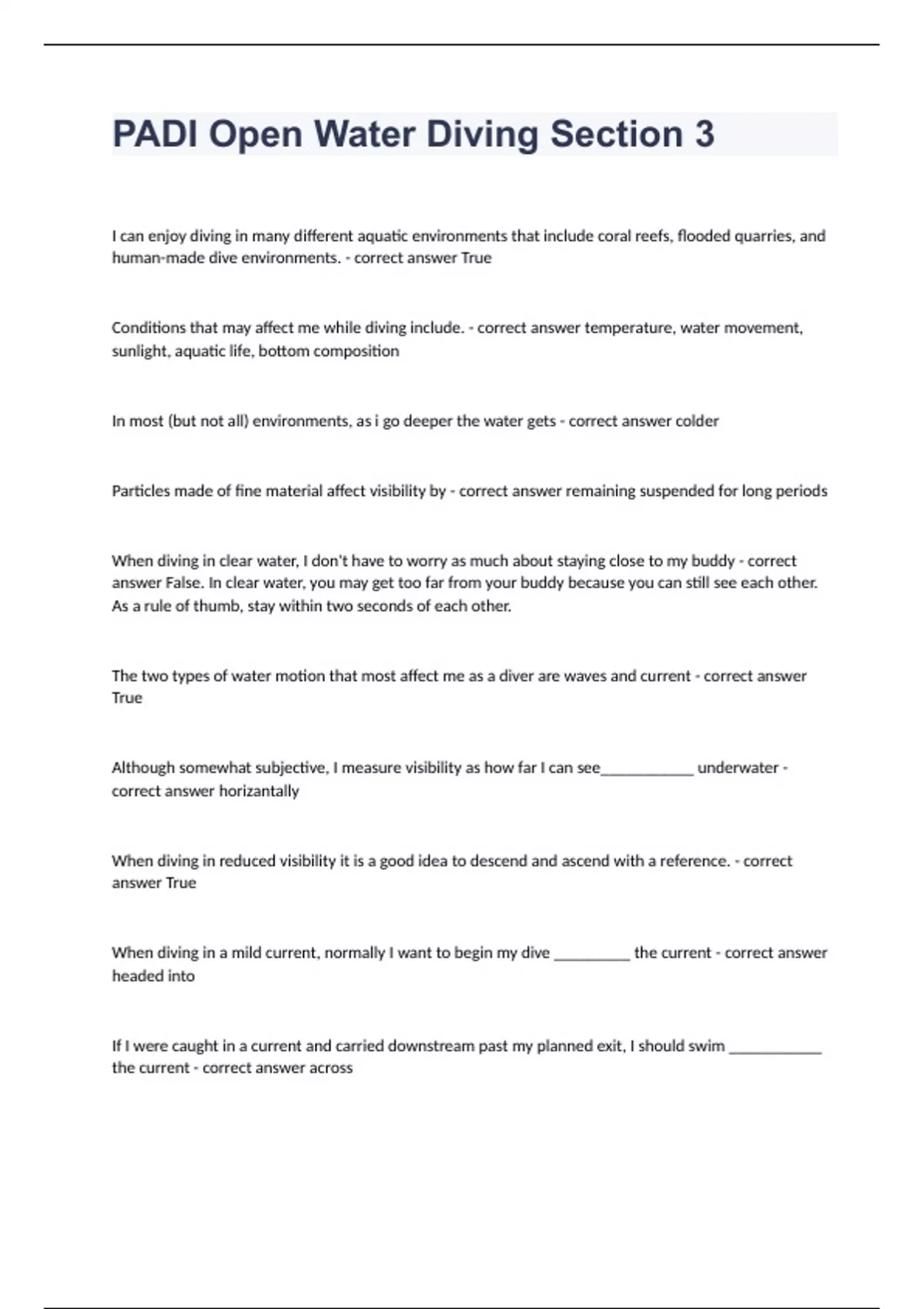PADI Open Water Diving Section 3I can enjoy diving in many different aquatic environments that include coral reefs, flooded quarries, and human-made dive environments. - correct answer True Conditions that may affect me while diving include. - correct answer temperature, water movement, sunlight, aquatic life, bottom composition In most (but not all) environments, as i go deeper the water gets - correct answer colder Particles made of fine material affect visibility by - correct answer remaining suspended for long periods When diving in clear water, I don't have to worry as much about staying close to my buddy - correct answer False. In clear water, you may get too far from your buddy because you can still see each other. As a rule of thumb, stay within two seconds of each other. The two types of water motion that most affect me as a diver are waves and current - correct answer True Although somewhat subjective, I measure visibility as how far I can see___________ underwater - correct answer horizantally When diving in reduced visibility it is a good idea to descend and ascend with a reference. - correct answer True When diving in a mild current, normally I want to begin my dive _________ the current - correct answer headed into If I were caught in a current and carried downstream past my planned exit, I should swim ___________ the current - correct answer across