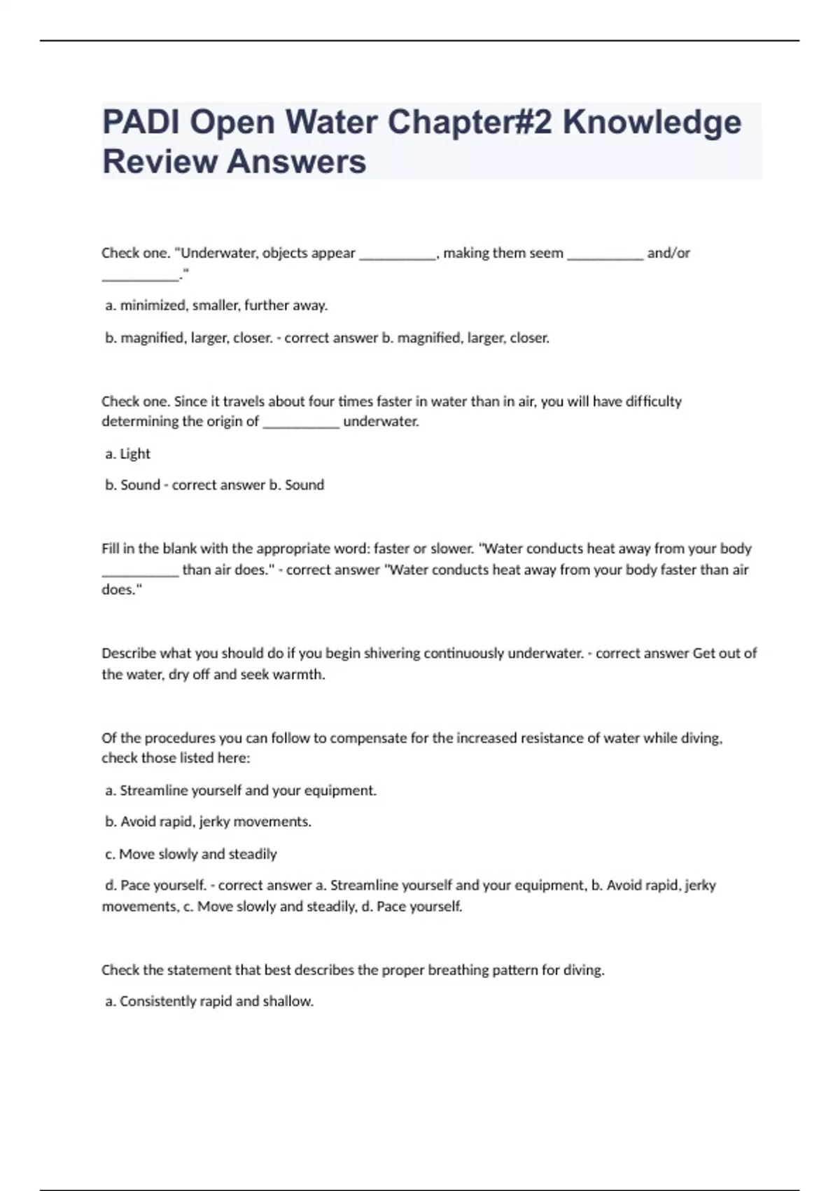 PADI Open Water Chapter#2 Knowledge Review AnswersCheck one. "Underwater, objects appear __________, making them seem __________ and/or __________." a. minimized, smaller, further away. b. magnified, larger, closer. - correct answer b. magnified, larger, closer. Check one. Since it travels about four times faster in water than in air, you will have difficulty determining the origin of __________ underwater. a. Light b. Sound - correct answer b. Sound Fill in the blank with the appropriate word: faster or slower. "Water conducts heat away from your body __________ than air does." - correct answer "Water conducts heat away from your body faster than air does." Describe what you should do if you begin shivering continuously underwater. - correct answer Get out of the water, dry off and seek warmth. Of the procedures you can follow to compensate for the increased resistance of water while diving, check those listed here: a. Streamline yourself and your equipment. b. Avoid rapid, jerky movements. c. Move slowly and steadily d. Pace yourself. - correct answer a. Streamline yourself and your equipment, b. Avoid rapid, jerky movements, c. Move slowly and steadily, d. Pace yourself. Check the statement that best describes the proper breathing pattern for diving. a. Consistently rapid and shallow. b. Consistently slow and deep. - correct answer b. Consistently slow and deep. It is easy to prevent overexertion while diving. Check the proper preventative measures listed here. a. Move slowly and avoid extended strenuous activity. b. Use your arms rather than your legs for propulsion underwater. c. Know your physical limits. - correct answer a. Move slowly and avoid extended strenuous activity, c. Know your physical limits. Explain what to do if you become overexerted while diving. a. Under water: b. At the surface: - correct answer a. Under water: Stop all activity, breathe deeply and rest. Hold onto an object for support if possible. b. At the surface: Establish buoyancy and stop moving. Rest and catch your breath. Once recovered move at slower pace. Check each statement that describes a technique used for airway control: a. Use your tongue as a splash guard by placing the tip on the roof of your mouth. b. Inhale slowly. c. Avoid rapid, jerky movement. d. Inhale cautiously. - correct answer a. Use your tongue as a splash guard by placing the tip on the roof of your mouth, b. Inhale slowly, d. Inhale cautiously. Explain why it is important not to wear a tight-fitting hood. - correct answer A hood that's too tight can cause changes in the heart rate due to compression of the arteries in the neck. Check the appropriate answer. The most important feature of any weight system is:
