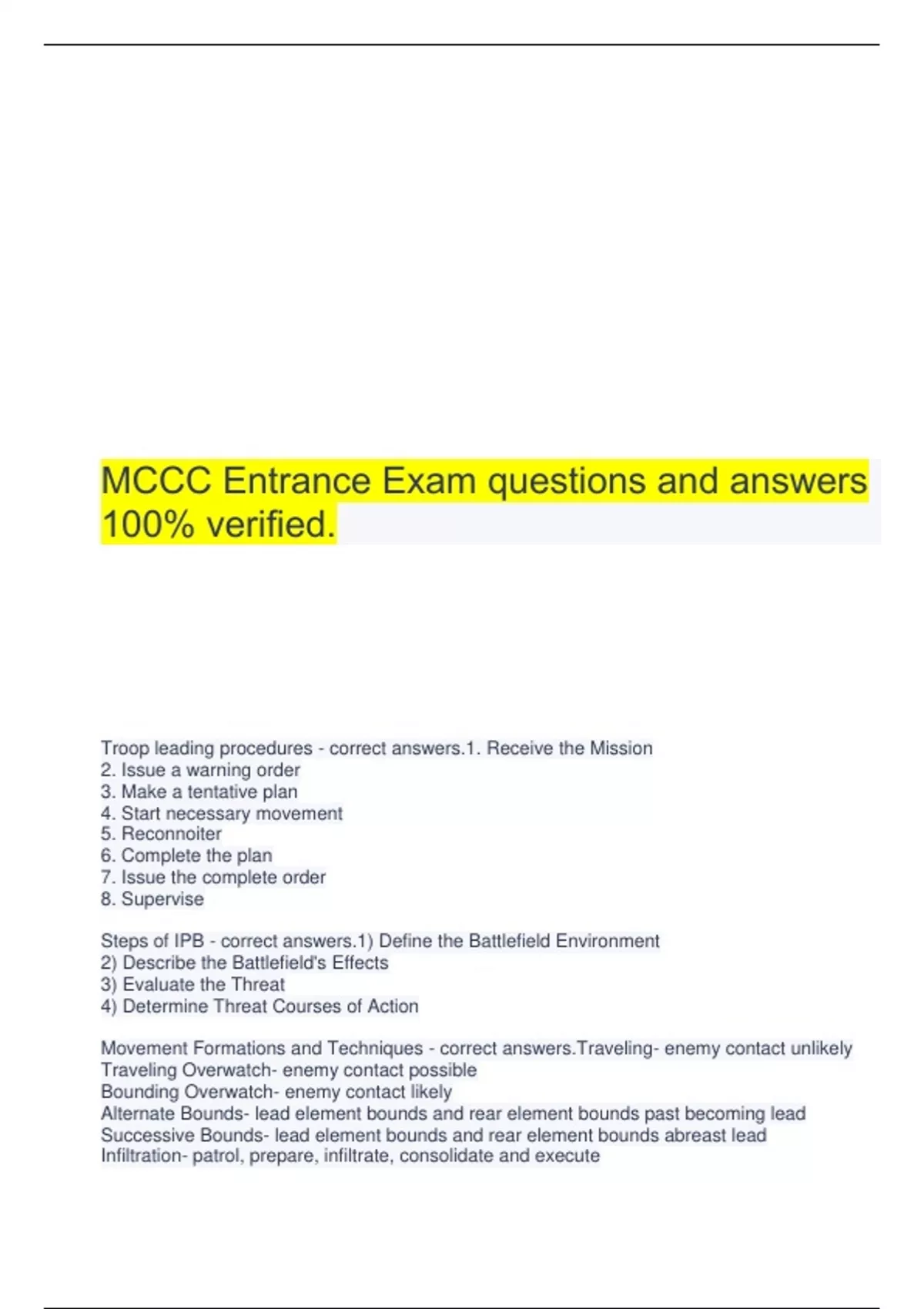 MCCC Entrance Exam questions and answers 100% verified. Troop leading procedures - correct answers.1. Receive the Mission 2. Issue a warning order 3. Make a tentative plan 4. Start necessary movement 5. Reconnoiter 6. Complete the plan 7. Issue the complete order 8. Supervise Steps of IPB - correct answers.1) Define the Battlefield Environment 2) Describe the Battlefield's Effects 3) Evaluate the Threat 4) Determine Threat Courses of Action Movement Formations and Techniques - correct answers.Traveling- enemy contact unlikely Traveling Overwatch- enemy contact possible Bounding Overwatch- enemy contact likely Alternate Bounds- lead element bounds and rear element bounds past becoming lead Successive Bounds- lead element bounds and rear element bounds abreast lead Infiltration- patrol, prepare, infiltrate, consolidate and execute Principles of War - correct answers.Objective- Direct every military operation toward a clearly defined, decisive, and attainable objective. Offensive-Seize, retain, and exploit the initiative. Mass- Concentrate the effects of combat power at the decisive place and time. Economy of Force- Allocate minimum essential combat power to secondary efforts. Maneuver- Place the enemy in a disadvantageous position through the flexible application of combat power. Unity of Command- For every objective, ensure unity of effort under one responsible commander. Security- Never permit the enemy to acquire an unexpected advantage. Surprise- Strike the enemy at a time or place or in a manner for which he is unprepared. Simplicity- Prepare clear, uncomplicated plans and clear, concise orders to ensure thorough understanding. Defensive Operations - correct answers.Combat operations conducted to defeat an enemy attack, gain time, economize forces, and develop conditions favorable for offensive or stability operations. Primary Defensive Tasks - correct answers.Mobile Defense Area Defense Retrograde Mobile and Static Elements in the Defense Purposes of Defensive Operations - correct answers.Deter or Defeat Enemy Offensive Operations Gain Time Achieve Economy of Force Retain Key Terrain Protect the Populace, Critical Assets, and Infrastructure Develop Intelligence Offensive Operations - correct t operations conducted to defeat and destroy enemy forces and seize terrain, resources, and population centers. They impose the commander's will on the enemy. Primary Offensive Tasks - correct answers.Movement to Contact Attack Exploitation Pursuit Purposes of Offensive Operations - correct answers.Dislocate, Isolate, Disrupt, and Destroy Enemy Forces Seize Key Terrain Deprive the Enemy of Resources Develop Intelligence Deceive and Divert the Enemy Create a Secure Environment for Stability Operations Forms of Maneuver - correct answers.Envelopment- Maneuver in which an attacking force seeks to avoid the principal enemy defenses by seizing objectives to the enemy rear to destroy the enemy in his current positions. Turning Movement- Maneuver in which the attacking force seeks to avoid the enemy's principal defensive positions by seizing objectives to the enemy rear and causing the enemy to move out of his current positions or divert major forces to meet the threat. Infiltration- Maneuver in which an attacking force conducts undetected movement through or into an area occupied by enemy forces to occupy a position of advantage in the enemy rear while exposing only small elements to enemy defensive fires Penetration- Maneuver in which an attacking force seeks to rupture enemy defenses on a narrow front to disrupt the defensive system. Frontal Attack- Frequently the most costly form of maneuver, since it exposes the majority of the attackers to the concentrated fires of the defenders. Breaching Tenets - correct answers.Intelligence Breaching fundamentals Breaching organization Mass Synchronization Breaching Fundamentals - correct answers.SOSRA Suppress Obscure Secure Reduce Assault Elements of Combat Power - correct answers.Movement and Maneuver Intelligence Fires Sustainment Command and Control Protection Leadership Information Levels of War - correct answers.Strategic- national policy and theater strategy Operational- campaigns and major operations Tactical- battles, engagements and small-unit and crew actions Warfighting Functions - correct answers.Movement and Maneuver Intelligence Fires Sustainment Command and Control Protection OAKOC - correct answers.Observation and Fields of Fire Avenues of Approach Key Terrain Obstacles Cover and Concealment Weapons Control Status - correct answers.Weapons Free- Crews can fire at any air target not positively identified as friendly. This is the least restrictive WCS level. Weapons Tight- Crews can fire only at air targets positively identified as hostile according to the prevailing hostile criteria. Weapons Hold- Crews are prohibited from firing except in self-defense or in response to a formal order. This is the most restrictive control status level.