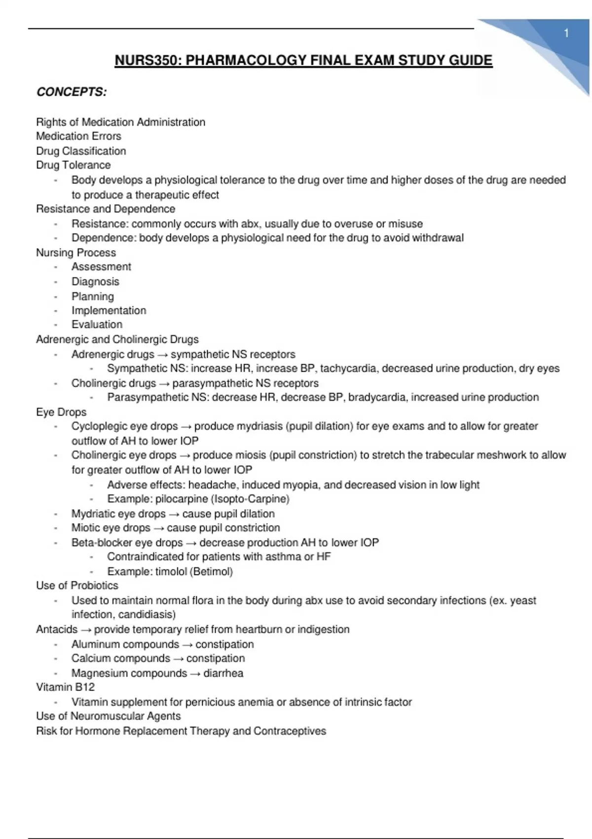 PORTAGE LEARNING NURS350: PHARMACOLOGY FINAL EXAM STUDY GUIDE