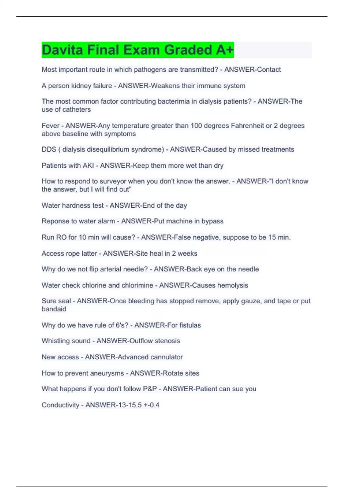 Most important route in which pathogens are transmitted? - ANSWER-Contact A person kidney failure - ANSWER-Weakens their immune system The most common factor contributing bacterimia in dialysis patients? - ANSWER-The use of catheters Fever - ANSWER-Any temperature greater than 100 degrees Fahrenheit or 2 degrees above baseline with symptoms DDS ( dialysis disequilibrium syndrome) - ANSWER-Caused by missed treatments Patients with AKI - ANSWER-Keep them more wet than dry How to respond to surveyor when you don't know the answer. - ANSWER-"I don't know the answer, but I will find out" Water hardness test - ANSWER-End of the day Reponse to water alarm - ANSWER-Put machine in bypass Run RO for 10 min will cause? - ANSWER-False negative, suppose to be 15 min. Access rope latter - ANSWER-Site heal in 2 weeks Why do we not flip arterial needle? - ANSWER-Back eye on the needle Water check chlorine and chlorimine - ANSWER-Causes hemolysis Sure seal - ANSWER-Once bleeding has stopped remove, apply gauze, and tape or put bandaid Why do we have rule of 6's? - ANSWER-For fistulas Whistling sound - ANSWER-Outflow stenosis New access - ANSWER-Advanced cannulator How to prevent aneurysms - ANSWER-Rotate sites What happens if you don't follow P&P - ANSWER-Patient can sue you Conductivity - ANSWER-13-15.5 +-0.4