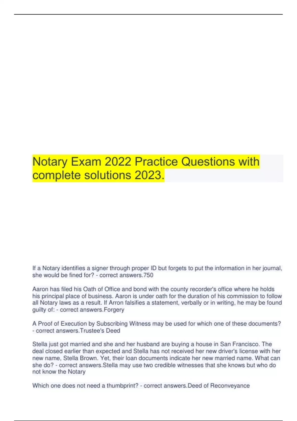 Notary Exam 2022 Practice Questions with complete solutions 2023. If a Notary identifies a signer through proper ID but forgets to put the information in her journal, she would be fined for? - correct answers.750 Aaron has filed his Oath of Office and bond with the county recorder's office where he holds his principal place of business. Aaron is under oath for the duration of his commission to follow all Notary laws as a result. If Arron falsifies a statement, verbally or in writing, he may be found guilty of: - correct answers.Forgery A Proof of Execution by Subscribing Witness may be used for which one of these documents? - correct answers.Trustee's Deed Stella just got married and she and her husband are buying a house in San Francisco. The deal closed earlier than expected and Stella has not received her new driver's license with her new name, Stella Brown. Yet, their loan documents indicate her new married name. What can she do? - correct answers.Stella may use two credible witnesses that she knows but who do not know the Notary Which one does not need a thumbprint? - correct answers.Deed of Reconveyance (Quit Claim Deed, Power of Attorney, and Deed of Trust all need a thumbprint) A Subscribing Witness appears at a notary's office and asks them to notarize their signature. The Notary can notarize the document if_______. Fill in the blank. - correct answers.The Subscribing Witness also brought a credible witness When a Notary moves to a new county, he must: - correct answers.Inform the SOS of his new address. What year did mandatory education for notaries become a law? - correct answers.July 1, 2005 Maria is a commissioned notary public, her principal place of business is in Truckee, California. Accordingly, Maria filed her oath and bond at the Nevada County Clerk's office in Nevada County, California. Maria often travels to South Lake Tahoe, in El Dorado County, to perform notarial acts for residents there. Her friend Patrick asks her to come to his home in Stateline, Nevada, to perform an acknowledgment on a document to be filed in El Dorado County. - correct answers.Maria must refuse to perform the acknowledgement in the State of Nevada A Notary's commission expires but a friend needs loan documents notarized. If the former Notary notarized home loan refinance documents without informing his friend that his commission expired, the former Notary would be guilty of: - correct answers.A felony The following journal information is required except: A. Time and date of the notarization B. Title or Character of document. C. A thumbprint from the signer if the document is affecting real property or Power of Attorney D. Type of notarization. E. Phone number of the document signer - correct answers.E. Phone number of the document signer Jim is a paralegal and works at the law offices of Smith and Smith. His employer asks him to become a Notary public and pays for his education, supplies and filing fees. Jim agrees and becomes a commissioned Notary Public. His employer has him sign an agreement that says he will not charge any fees to the law office for Notarial services and will remit any fees from clients to the law office. Jim's sister asks him to come over to acknowledge an Interspousal Transfer Deed she signed. - correct answers.Jim may notarize this document and keep the fees Dan Withers works as a dispatcher at a police station. His employer asks him to become a Notary and pays for his supplies. Dan can do all of the following except: A. Notarize at his place of employment. B. Keep all Notary fees charged. C. Remit Notary fees to employer. D. Charge for notarizations. - correct answers.B. Keep all notary fees charged A Notary who violates advertising restrictions could be subject to the following actions by the Secretary of State: - correct answers.1500 penalty, revoke or suspend a notary's commission If a Notary commits or omits acts constituting suspension or revocation of their commission, they will have a right to a hearing unless: - correct answers.The Secretary of State has denied