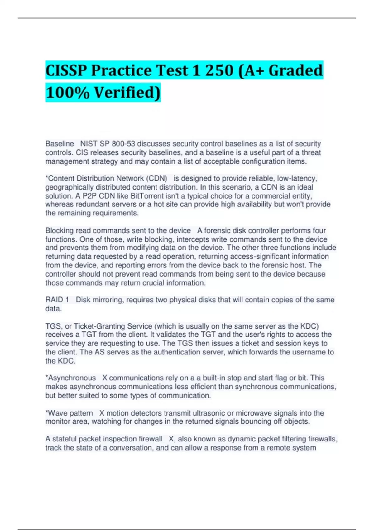 CISSP Practice Test 1 250 (A+ Graded 100% Verified) Baseline NIST SP 800-53 discusses security control baselines as a list of security controls. CIS releases security baselines, and a baseline is a useful part of a threat management strategy and may contain a list of acceptable configuration items. *Content Distribution Network (CDN) is designed to provide reliable, low-latency, geographically distributed content distribution. In this scenario, a CDN is an ideal solution. A P2P CDN like BitTorrent isn't a typical choice for a commercial entity, whereas redundant servers or a hot site can provide high availability but won't provide the remaining requirements. Blocking read commands sent to the device A forensic disk controller performs four functions. One of those, write blocking, intercepts write commands sent to the device and prevents them from modifying data on the device. The other three functions include returning data requested by a read operation, returning access-significant information from the device, and reporting errors from the device back to the forensic host. The controller should not prevent read commands from being sent to the device because those commands may return crucial information. RAID 1 Disk mirroring, requires two physical disks that will contain copies of the same data. TGS, or Ticket-Granting Service (which is usually on the same server as the KDC) receives a TGT from the client. It validates the TGT and the user's rights to access the service they are requesting to use. The TGS then issues a ticket and session keys to the client. The AS serves as the authentication server, which forwards the username to the KDC. *Asynchronous X communications rely on a a built-in stop and start flag or bit. This makes asynchronous communications less efficient than synchronous communications, but better suited to some types of communication. *Wave pattern X motion detectors transmit ultrasonic or microwave signals into the monitor area, watching for changes in the returned signals bouncing off objects. A stateful packet inspection firewall X, also known as dynamic packet filtering firewalls, track the state of a conversation, and can allow a response from a remote system based on an internal system being allowed to start the communication. Static packet filtering and circuit level gateways only filter based on source, destination, and ports, whereas application-level gateway firewalls proxy traffic for specific applications. A captive portal X can require those who want to connect to and use Wi-Fi to provide an email address to connect. This allows Ben to provide easy-to-use wireless while meeting his business purposes. WPA2 PSK is the preshared key mode of WPA and won't provide information about users who are given a key. Sharing a password doesn't allow for data gathering either. Port security is designed to protect wired network ports based on MAC addresses. *Set up a separate SSID using WPA2. Many modern wireless routers can provide multiple SSIDs. Ben can create a private, secure network for his business operations, but he will need to make sure that the customer and business networks are firewalled or otherwise logically separated from each other. Running WPA2 on the same SSID isn't possible without creating another wireless network and would cause confusion for customers (SSIDs aren't required to be unique). Running a network in Enterprise mode isn't used for open networks, and WEP is outdated and incredibly vulnerable. Open networks are unencrypted, making traffic easily sniffable. Unencrypted open networks broadcast traffic in the clear. This means that unencrypted sessions to websites can be easily captured with a packet sniffer. Some tools like FireSheep have been specifically designed to capture sessions from popular websites. Fortunately, many now use TLS by default, but other sites still send user session information in the clear. Shared passwords are not the cause of the vulnerability, ARP spoofing isn't an issue with wireless networks, and a Trojan is designed to look like safe software, not to compromise a router. *AES The DES modes of operation are Electronic Codebook (ECB), Cipher Block Chaining (CBC), Cipher Feedback (CFB), Output Feedback (OFB), and Counter (CTR). The Advanced Encryption Standard (AES) is a separate encryption algorithm. Clipping X is an analysis technique that only reports alerts after they exceed a set threshold. It is a specific form of sampling, which is a more general term that describes any attempt to excerpt records for review. Thresholding is not a commonly used term. Administrators may choose to configure automatic or manual account lockout after failed login attempts but that is not described in the scenario. RADIUS X is a common AAA technology used to provide services for dial-up, wireless networks, network devices, and a range of other systems. OAuth is an authentication protocol used to allow applications to act on a user's behalf without sharing the password, and is used for many web applications. While both XTACACS and TACACS+ provide the functionality Sally is looking for, both are Cisco proprietary protocols. Inference In an X attack, the attacker uses several pieces of generic nonsensitive information to determine a specific sensitive value. *Take rule The X allows a subject to take the rights belonging to another object. If Alice has take rights on Bob, she can give herself the same permissions that Bob already possesses. A brute-force attack X attacks try every possible password. In this attack, the password is changing by one letter at each attempt, which indicates that it is a brute-force attack. A dictionary attack would use dictionary words for the attack, whereas a man-in-the-middle or pass-the-hash attack would most likely not be visible in an authentication log except as a successful login. *Isolation X requires that transactions operate separately from each other. Atomicity ensures that if any part of a databas