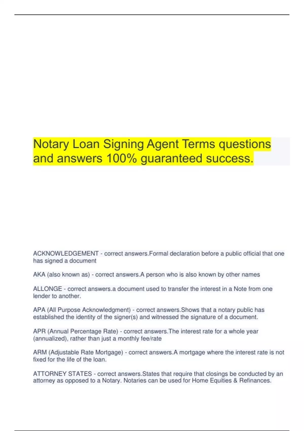 Notary Loan Signing Agent Terms questions and answers 100% guaranteed success. ACKNOWLEDGEMENT - correct answers.Formal declaration before a public official that one has signed a document AKA (also known as) - correct answers.A person who is also known by other names ALLONGE - correct answers.a document used to transfer the interest in a Note from one lender to another. APA (All Purpose Acknowledgment) - correct answers.Shows that a notary public has established the identity of the signer(s) and witnessed the signature of a document. APR (Annual Percentage Rate) - correct answers.The interest rate for a whole year (annualized), rather than just a monthly fee/rate ARM (Adjustable Rate Mortgage) - correct answers.A mortgage where the interest rate is not fixed for the life of the loan. ATTORNEY STATES - correct answers.States that require that closings be conducted by an attorney as opposed to a Notary. Notaries can be used for Home Equities & Refinances. BALLOON PAYMENT - correct answers.A loan which does not fully amortize over the term of the loan. BUYER - correct answers.Person(s) purchasing property CLOUD ON TITLE - correct answers.Deed that is recorded but includes an unusual characteristic that would give a person pause before accepting title. COMMITMENT LETTER - correct answers.A letter that provides the borrower a summary of all terms of the loan COMMUNITY PROPERTY - correct rty acquired during marriage and owned equally by both spouses even upon divorce COMPLIANCE AGREEMENT - correct answers.Agreement where borrowers must be willing to resign certain loan documents if the mortgage company deems that there was incomplete or incorrect confirmation email - correct answers.The email sent to the Notary which provides all of the information about their assignment. CORPORATE ASSIGNMENT OF DEED OF TRUST - correct answers.The document used to transfer the interest in a Deed of Trust from one lender to another. DEED - correct answers.Formal written document transferring title of real estate Deed of Trust - correct answers.Security instrument that is recorded to give added assurance that the promissory note will be paid when due. Places a public notification that there is a loan against the property. For the lender to foreclose, they are NOT required to use the court system or the sheriff's office. DOCS - correct answers.Slang for loan documents. EASEMENT - correct answers.a certain right to use the real property of another without legal possession. ENCROACHMENT - correct answers.a term which implies "advance beyond proper limits". ESCROW OFFICER - correct answers.An unbiased third party between Buyers, Sellers, and Lenders. They are responsible for the exchange of property and money between the parties once all requirements have been met. ESCROW/IMPOUND ACCOUNT - correct answers.An account maintained by the lender for payment of property taxes, homeowners insurance, mortgage insurance or other expenses FIXED RATE MORTGAGE - correct answers.A mortgage where the interest rate is fixed for the life of the loan. FHA - correct ed in 1934, They insure loans made by banks and other private lenders for home building and home buying. FKA (Formerly Known As.) - correct answers.Someone who once had a different legal name but switched it