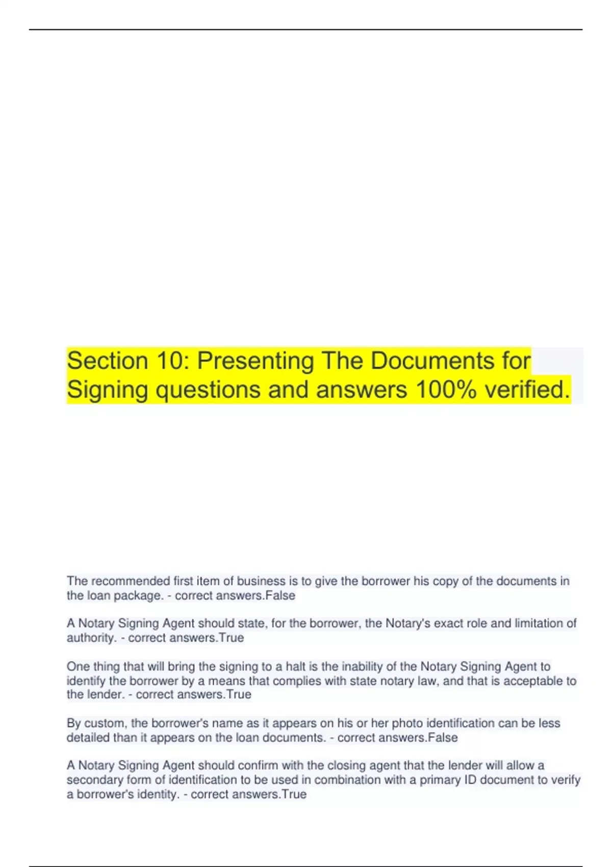 Section 10: Presenting The Documents for Signing questions and answers 100% verified. The recommended first item of business is to give the borrower his copy of the documents in the loan package. - correct answers.False A Notary Signing Agent should state, for the borrower, the Notary's exact role and limitation of authority. - correct answers.True One thing that will bring the signing to a halt is the inability of the Notary Signing Agent to identify the borrower by a means that complies with state notary law, and that is acceptable to the lender. - correct answers.True By custom, the borrower's name as it appears on his or her photo identification can be less detailed than it appears on the loan documents. - correct answers.False A Notary Signing Agent should confirm with the closing agent that the lender will allow a secondary form of identification to be used in combination with a primary ID document to verify a borrower's identity. - correct answers.True The U.S. Patriot Act CIP Form documents the Notary's compliance with certain Patriot Act requirements. - correct answers.False A borrower may use a variety of name or initialing formats to execute loan documents, as long as the Notary Signing Agent observes all signatures and initials being made. - correct answers.False The borrower must give the cash-to-close funds to the Notary Signing Agent to be returned with the signed loan documents, but sends any "stipulations" directly to the lender. - correct answers.False When presenting loan documents a Notary Signing Agent does not offer opinions or advice, and limits comments to "what" each loan document is, "where" to find information, and "where" to sign or initial. - correct answers.True Every loan document package will include a Deed of Trust, and a Mortgage document. - correct answers.False A good time to give the borrower his or her copy of the loan documents is while the Notary Signing Agent is performing a final check on the signed documents. - correct answers.True A Notary Signing Agent should quickly leave a finished signing in order to promptly perform his or her next tasks. - correct answers.True A Notary Signing Agent may answer "why," "how" and "when" questions as long as the borrower could also find the information right in the loan documents. - correct answers.False A Notary Signing Agent giving an opinion or advice about the contents or effects of any loan document or loan transaction could be seen as unlicensed practice of law. - correct answers.True When an unresolvable problem ends a loan document signing, the Notary Signing Agent may leave the borrower's copy of the loan documents to facilitate any subsequent discussion with the closing agent or lender representative. - correct answers.False If the borrower fails to present any required stipulations, the Notary Signing Agent should ask the closing agent whether the loan signing shall continue without the stipulations, or be stopped. - correct answers.True A Notary Signing Agent should speed-up a lengthy signing appointment by reviewing all the documents after the signing appointment is finished, and creating recordbook (journal) entries for all notarized documents at that time. - correct answers.False A Notary Signing Agent can safely navigate a borrower's questions during a signing appointment by answering only "what" or "where" questions that are answered within the loan documents themselves. - correct answers.True When a borrower has multiple "why/when/how" questions, a Notary Signing Agent should list them and present all questions to the closing agent at once, instead of calling the closing agent multiple times during the closing appointment. - correct answers.True