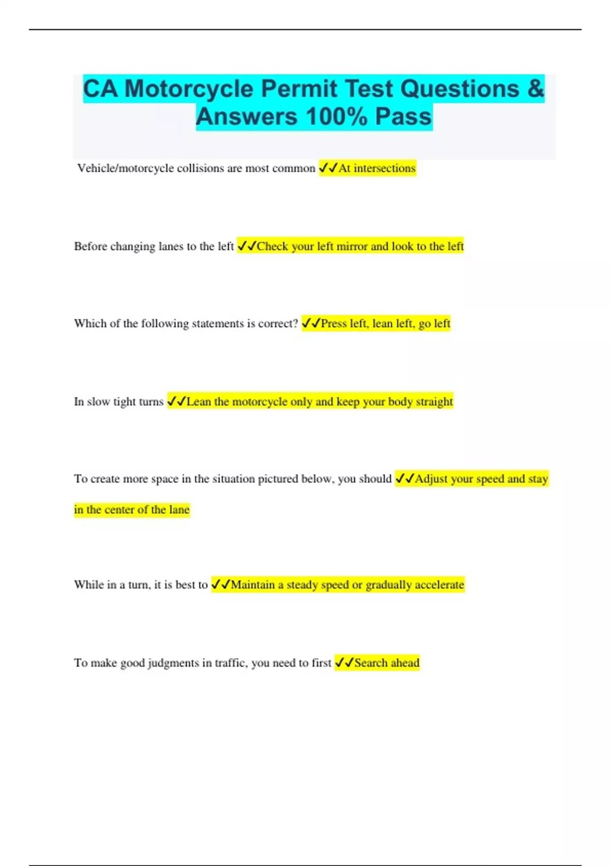 CA Motorcycle Permit Test Questions & Answers 100% Pass