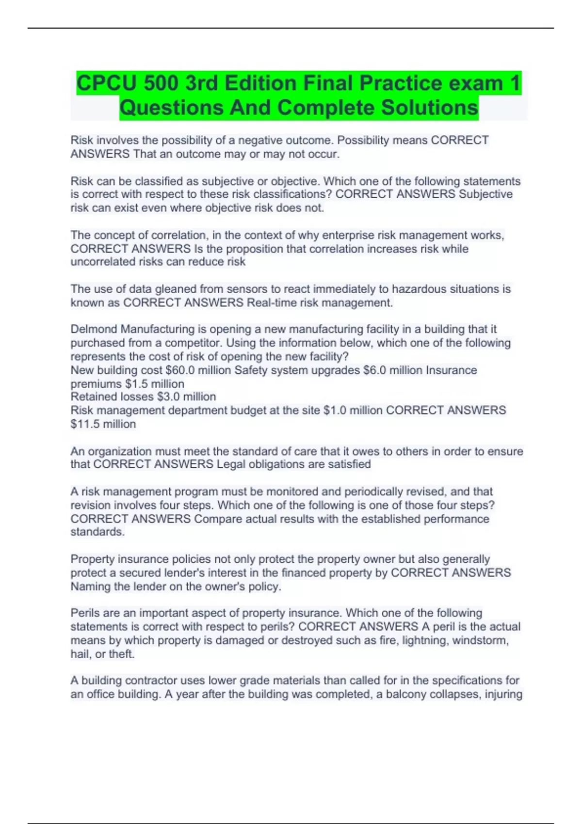 CPCU 500 3rd Edition Final Practice exam 1 Questions And Complete Solutions