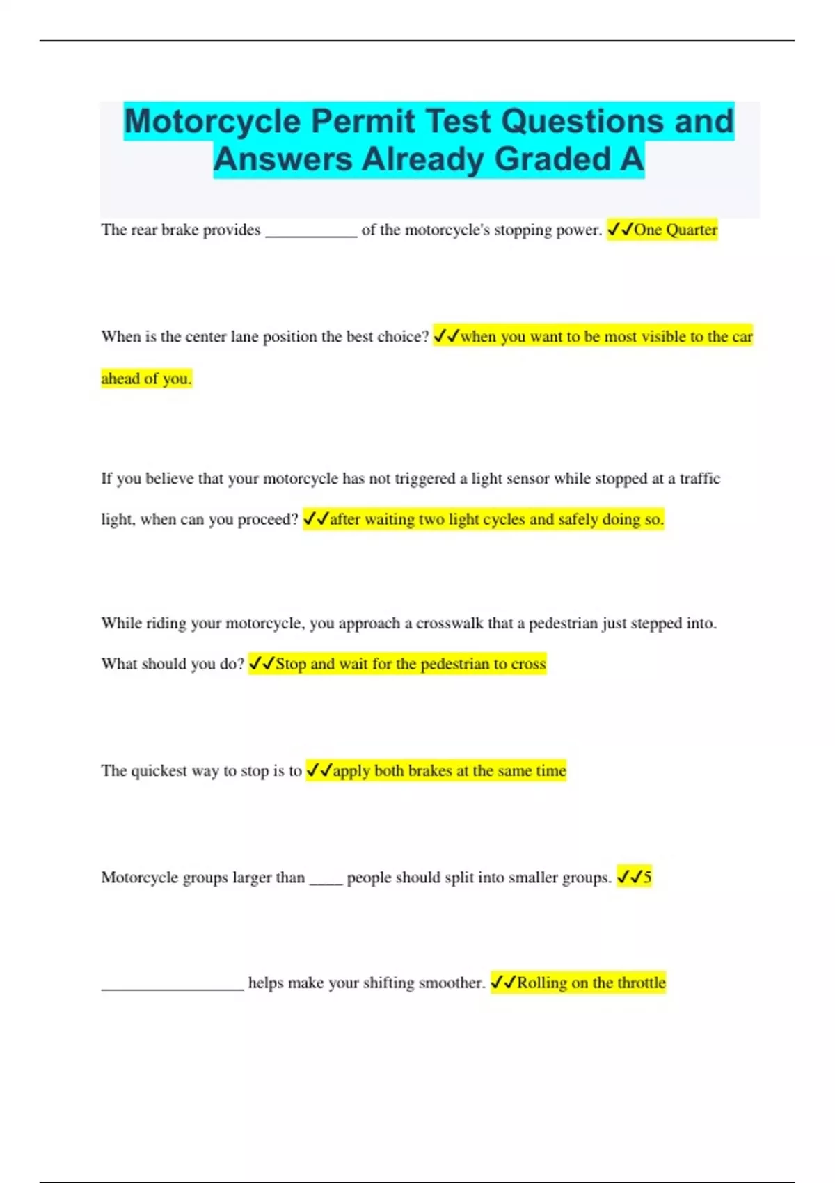 Motorcycle Permit Test Questions and Answers Already Graded A The rear brake provides ___________ of the motorcycle's stopping power. One Quarter When is the center lane position the best choice? when you want to be most visible to the car ahead of you. If you believe that your motorcycle has not triggered a light sensor while stopped at a traffic light, when can you proceed? after waiting two light cycles and safely doing so. While riding your motorcycle, you approach a crosswalk that a pedestrian just stepped into. What should you do? Stop and wait for the pedestrian to cross The quickest way to stop is to apply both brakes at the same time Motorcycle groups larger than ____ people should split into smaller groups. 5 _________________ helps make your shifting smoother. Rolling on the throttle If your throttle is stuck and twisting it does not release it, you should: Pull the kill engine switch. Signal lights on a motorcycle should be used: every time you plan to turn or change lanes. If you are about to collide with an object and you wish to get the motorcycle to lean quickly to the right, you should: push the inside of the right handle grip Rolling on the throttle through a turn will help stabilize the motorcycle if a vehicle enters your path, you should: Move away from the vehicle When making a normal turn, should the motorcycle rider lean? Yes the motorcyclist should lean with the motorcycle To stop as quick as possible, you should: Use both brakes at the same time Riding with both legs on the same side of the motorcycle is: never permitted Because riding a motorcycle is more tiring than driving a car, you should: Take frequent breaks By leaving a minimum of ____ seconds between yourself and the vehicle in front of you, you ensure you have enough stopping distance. 2 Maximum straight line braking is achieved by: applying both breaks without the wheels locking Before each motorcycle ride, you should adjust: side mirrors Why is maintaining a space cushion important? it gives you space to maneuver It gives you time to correct your mistakes It gives you time to react Begin signaling ____ feet before making a turn. 100