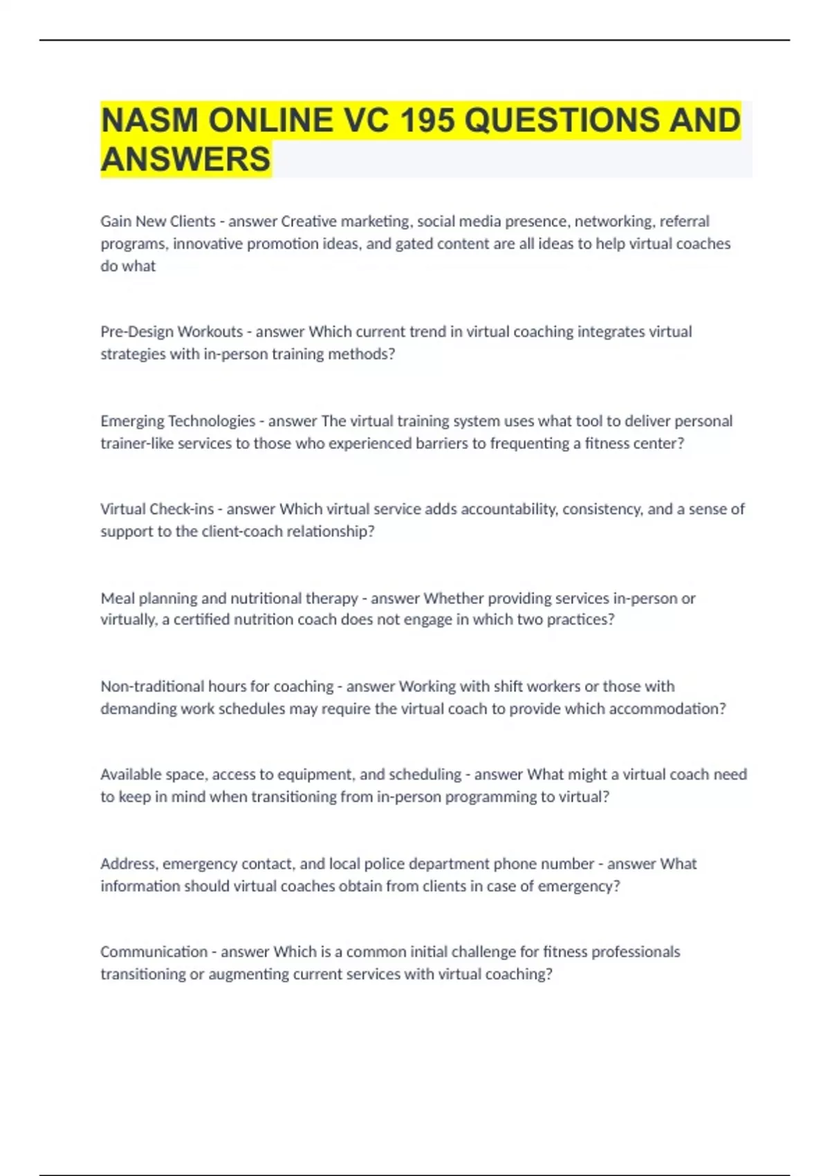 NASM ONLINE VC |195 QUESTIONS AND ANSWERS.
