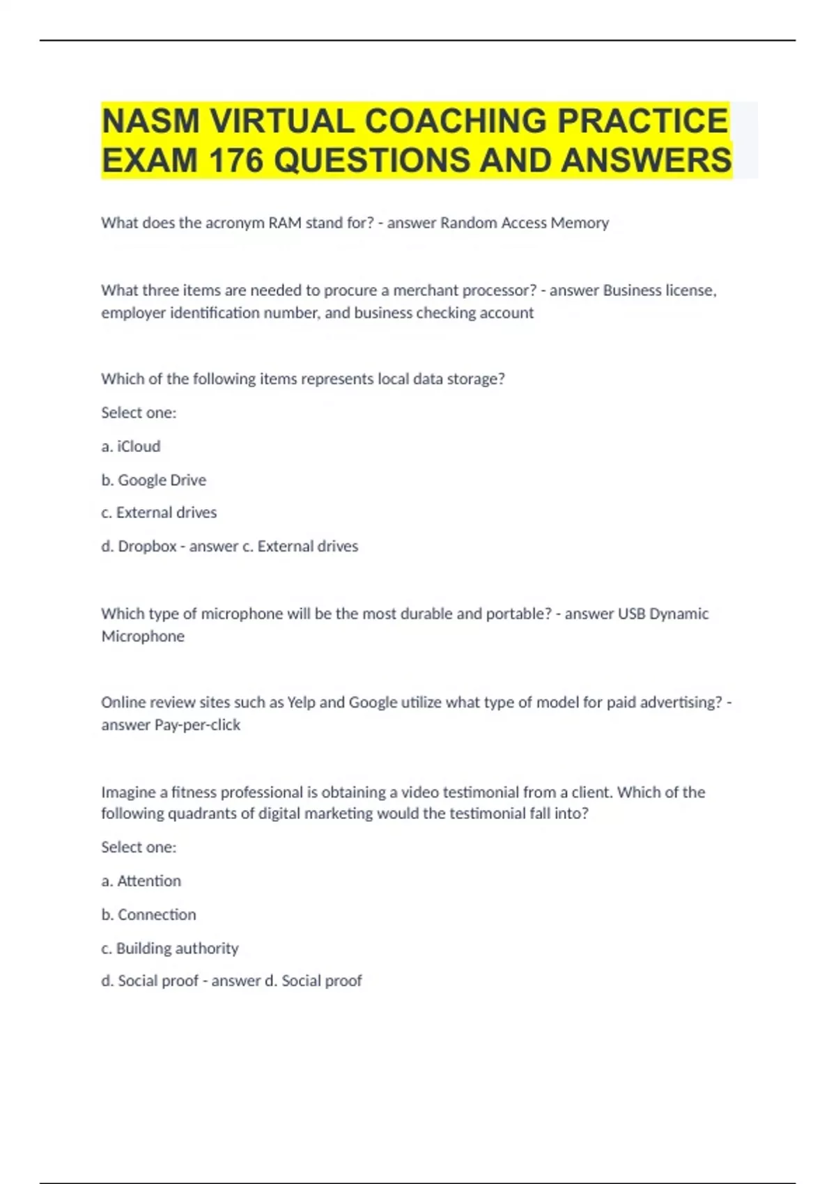 What does the acronym RAM stand for? Random Access Memory What three items are needed to procure a merchant processor? Business license, employer identification number, and business checking account Which of the following items represents local data storage? Select one: a. iCloud b. Google Drive c. External drives d. Dropbox c. External drives Which type of microphone will be the most durable and portable? USB Dynamic Microphone Online review sites such as Yelp and Google utilize what type of model for paid advertising? Pay-per-click Imagine a fitness professional is obtaining a video testimonial from a client. Which of the following quadrants of digital marketing would the testimonial fall into? Select one: a. Attention b. Connection c. Building authority d. Social proof d. Social proof What is it called when there has been a breach in the client and fitness professional relationship? Discord What is customer lifetime value (CLV)? The total amount a customer spends with a business over the lifetime of the relationship Oxygen is transported via a protein molecule in the red blood cells. What is the name of this protein molecule? Hemoglobin Which of the following is not one of the four P's of Marketing? Select one: a. Principle b. Price c. Product d. Promotion a. Principle Which of the following is not an example of word-of-mouth marketing? Select one: a. Referrals b. Merchandise c. Testimonials d. Webinars d. Webinars Which of the following posts on Instagram would fall under the Building Authority category of the four quadrants of digital marketing? Select one: a. A fitness professional calling out a common exercise they do not agree with b. Posting an exercise video with a detailed explanation c. Posting a picture of a client testimonial d. Posting a before-and-after picture of a client b. Posting an exercise video with a detailed explanation A fitness professional and client are about to engage in a high-intensity workout that includes multiple plyometric exercises. The client is going to be doing the workout on slick vinyl flooring. What should the fitness professional do? Select one: a. Pay no attention to what kind of flooring the client is training on. It is inappropriate for a fitness professional to ever discuss a client's environment or attire b. Educate the client on appropriate footwear and exercise form and pay attention to them during the training session c. Cancel the training session because vinyl flooring is always too dangerous to exercise on d. Ensure that the client is wearing footwear with minimal traction because that type of footwear moves the best on vinyl flooring b. Educate the client on appropriate footwear and exercise form and pay attention to them during the training session What are the cons of utilizing wearable technologies with more advanced features? They are often more expensive and increase the complexity of use Which is an example of an effective inbound prospecting strategy? Select one: a. Creating blog posts that follow a strategic search engine optimization (SEO) approach b. Cold calling c. Purchasing a list of consumers to call or e-mail d. Creating a mailer a. Creating blog posts that follow a strategic search engine optimization (SEO) approach Which service is often used to complement the virtual coaching experience? Select one: a. Nutrition coaching b. Predesigned workouts c. Virtual group fitness d. Personal training b. Predesigned workouts What is an anthropometric assessment? A quantitative evaluation or measurement of the physical body What is the most effective method to ensure the correct physical landmarks are measured during baseline circumference measurements? Select one: a. Guide clients via a telephone call or e-mail b. Guide clients with live video demonstrations and feedback c. Provide written instructions d. Provide prerecorded instructional videos b. Guide clients with live video demonstrations and feedback What is it called when an individual is being held responsible via an outward source to achieve their goals? Accountability Approximately when were the first wearable fitness trackers introduced? 1981 When selecting a products price, what is not important to consider? Select one: a. Comparable products b. Net profits c. Ability to discount d. Target market c. Ability to discount In general, what type of biometric trend is favorable, indicating an improvement in stress resilience and physical and mental health? A steady increase in HRV over time After establishing a baseline, a fitness professional recognizes a significant decrease in heart rate variability, elevated heart rate, and inadequate sleep duration. What type of training modifications should the fitness professional consider? Modify the program to focus on active or passive recovery Prior to engaging in a virtual training program, a new virtual training client communicates to a fitness professional that they have a medical condition that causes chest pain. They only experience chest pain occasionally while exercising. What should the fitness professional do? Refer the client to a medical professional for clearance prior to engaging in the training program Fitness professionals can employ which strategy to avoid being perceived as a typical salesperson? Put ethics and clients' interests first What is the term for an abnormally low concentration of oxygen in the blood? Hypoxemia In the model for five stages of change, at what stage does the client become aware that change is needed but is still struggling with required sacrifice? Contemplation