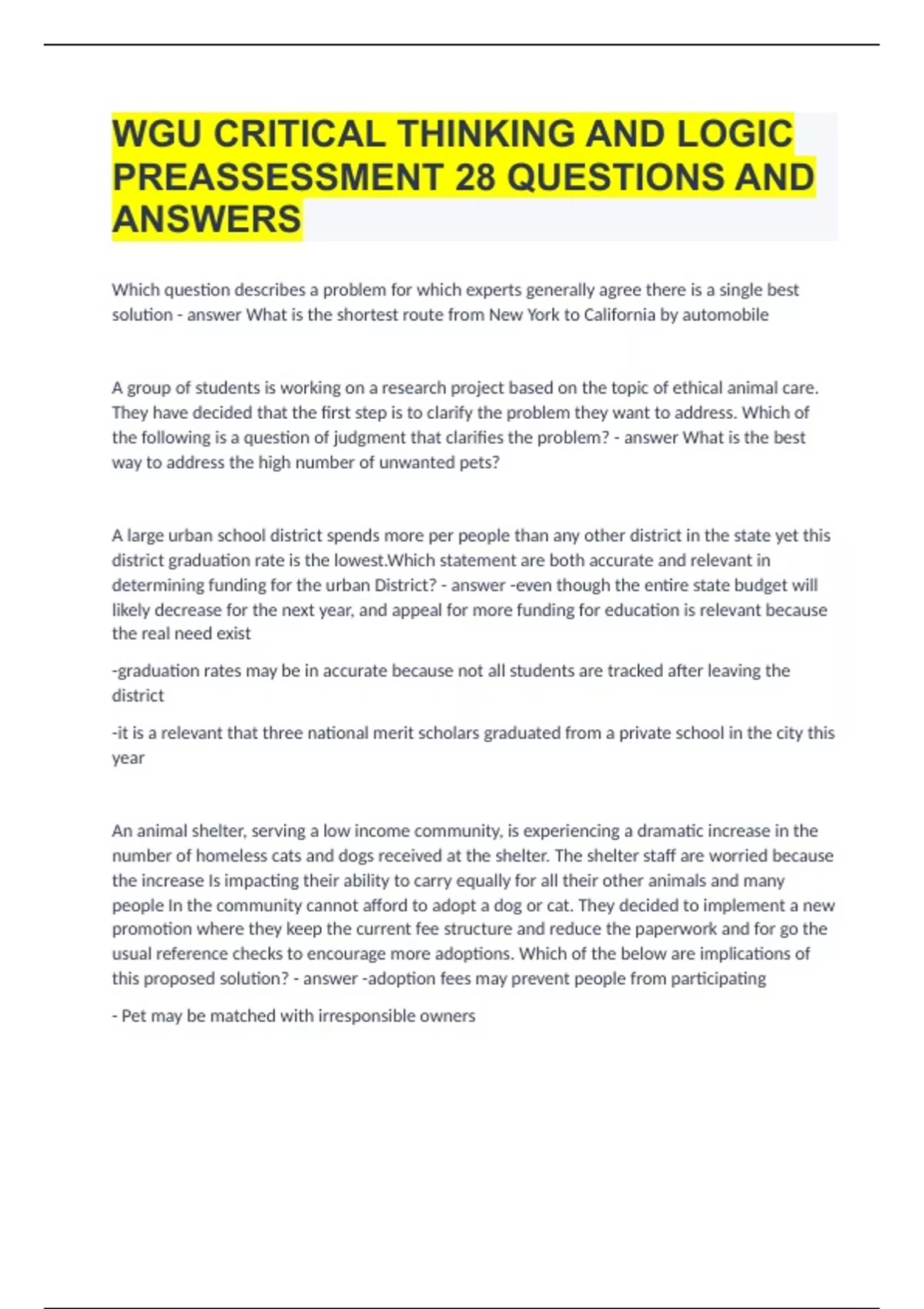 Which question describes a problem for which experts generally agree there is a single best solution What is the shortest route from New York to California by automobile A group of students is working on a research project based on the topic of ethical animal care. They have decided that the first step is to clarify the problem they want to address. Which of the following is a question of judgment that clarifies the problem? What is the best way to address the high number of unwanted pets? A large urban school district spends more per people than any other district in the state yet this district graduation rate is the lowest.Which statement are both accurate and relevant in determining funding for the urban District? -even though the entire state budget will likely decrease for the next year, and appeal for more funding for education is relevant because the real need exist -graduation rates may be in accurate because not all students are tracked after leaving the district -it is a relevant that three national merit scholars graduated from a private school in the city this year An animal shelter, serving a low income community, is experiencing a dramatic increase in the number of homeless cats and dogs received at the shelter. The shelter staff are worried because the increase Is impacting their ability to carry equally for all their other animals and many people In the community cannot afford to adopt a dog or cat. They decided to implement a new promotion where they keep the current fee structure and reduce the paperwork and for go the usual reference checks to encourage more adoptions. Which of the below are implications of this proposed solution? -adoption fees may prevent people from participating - Pet may be matched with irresponsible owners Which question requires critical thinking? What are ways to help ensure that rainbows will continue to be visible in the future You are writing an essay on proliferation of aids throughout the world. You have been asked to document the problem and it's possible solutions using evidence and reasoning. Which of the following would be relevant resources for this topic? -An essay by a medical Doctor Who has treated AIDS victims in other countries -A document that discusses the probable causes of aids in Africa -A speech given by a prominent researcher in the field of AIDS research The fair housing act prohibits housing discrimination on the basis of race, color, religion, sex, disability, age, familiar status, or national origin. Which of the following ethical perspectives are relevant to this law? -Children and adults should have equal access to recreational facilities in multiple housing development, such as condominium project -In multiple housing developments which have a no pets designation, blind resident should be allowed to keep guide dogs. -Reasonable people should respect the rights and needs of others in regard to housing World food prices have hit an all-time high, driven up by price increases in wheat, corn, sugar, and oil's. Which of the following are possible solutions to the given problem? -Consider the effects of greenhouse gases on climate change and set policies accordingly -Set government policies that will lower cost of basic food staples to the poorest people -Reconsider tax incentives offered for production of alternative fuels A student is writing a research paper that investigates the relationship of higher education to employment in the United States. Match the source of information with the phrase that describes its efficiency to the assignment. -A case study of one state employment rates that shows higher employment among those with a college degree ^Relies on inference -A university publication that describes a survey of 10 people with college degrees who report a high rate of employment in their field of study ^Exhibits bias -A peer reviewed journal article that shows that people with college degrees have a 20% better rate of employment than those with a high school diploma ^Provide scholarly support -A study that shows people with college degrees are more likely to engage in social activities ^Is irrelevant Read the following excerpt from Albert J beverage is 1898 Speech. Which to fallacies occur in the exert Flattering the audience, sweeping generalizations Do you do an increase in the number of degree programs at a local college there's been a significant increase in the job placements for graduates. Which of the following activities will help validate this explanation for the increase? Look for a common element another degree programs which lead to higher job placement During recent practices there has been a Significant increase in the number of sprained ankles and knees among players a very successful port sports teams that is going to compete in the state championship. What actions with sports coach take to determine injuries by using common factor method? -the coach would determjne if the injured players were playing the same position -The coach would investigate whether the injured Players warm up your routines were similar Animal testing question -The life of a human is more valuable than the life of an animal -Steps should be taken to see if human lives whenever is possible How would an elective officials point of you influence that officials approach to public education? -The officials desire to find an expensive Road building project may influence the officials to limit education funding. -The officials enthusiasm for sports may influence the officials to support funding for education if it includes increased spending for athletic programs. Increased tardiness It would make the teacher want to emphasize punctuality Tobacco question why should the campaign be regarded as potentially biased? Because it tobacco industry is a commercial enterprise that loses money when people stop smoking Crime scene Location of jewlery box Which of the following are standards of critical thinking Logic, significant, accuracy,