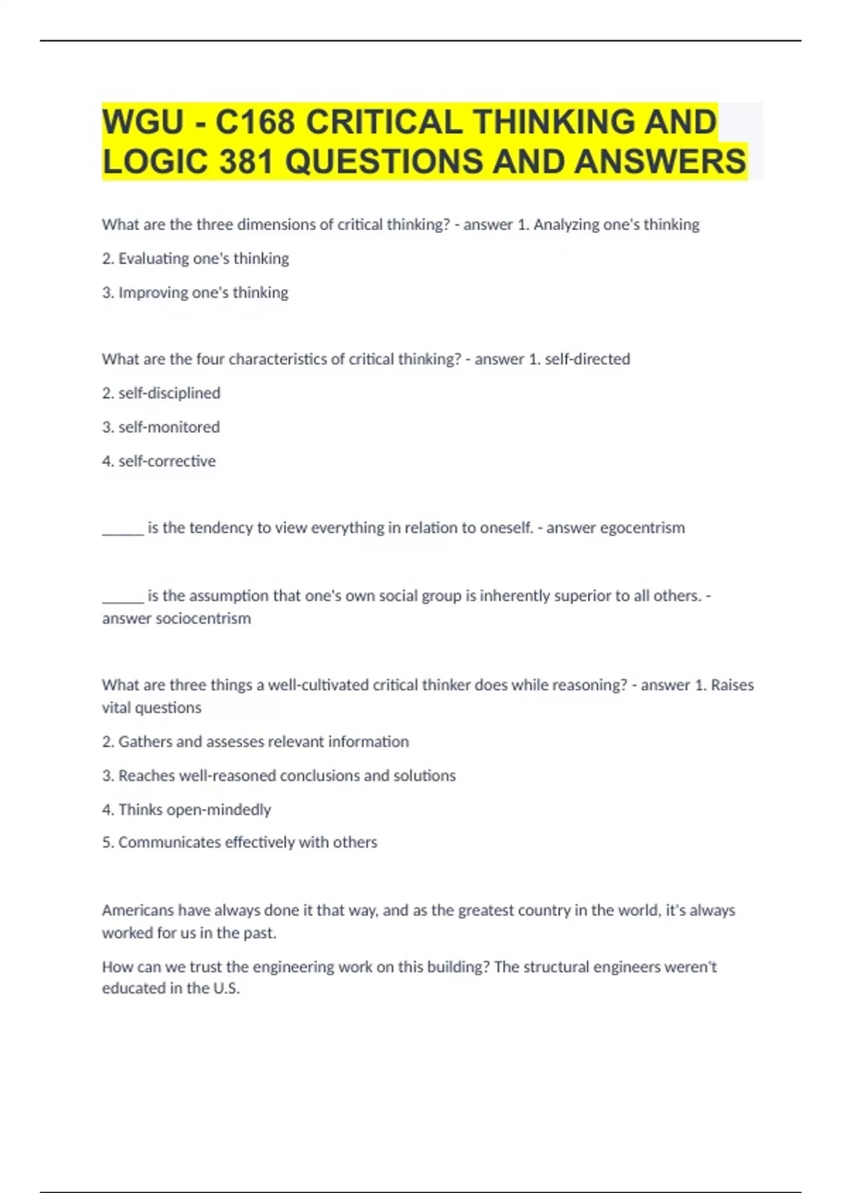 WGU - C168 CRITICAL THINKING AND LOGIC|381 QUESTIONS AND ANSWERS.