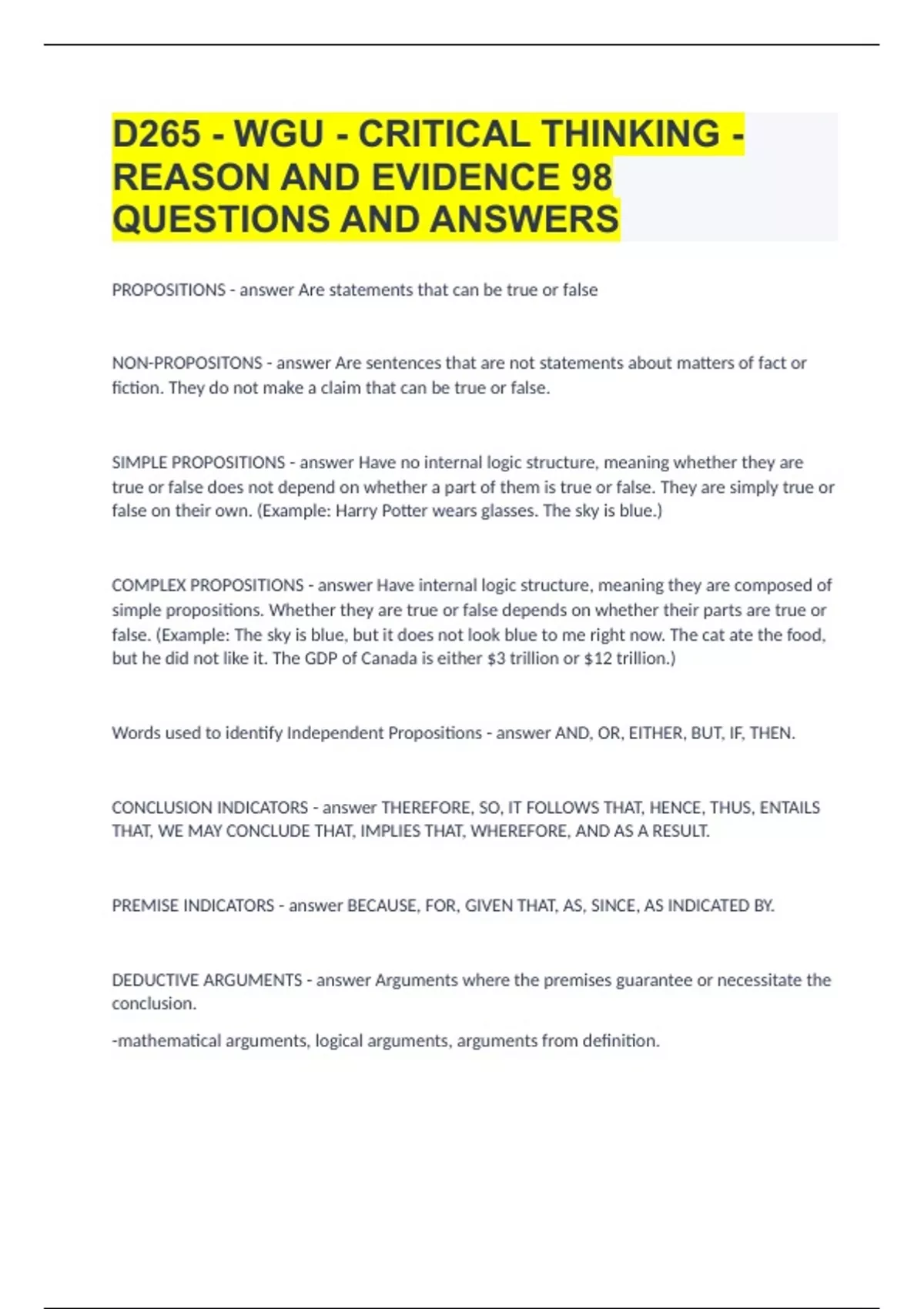 D265 - WGU - CRITICAL THINKING - REASON AND EVIDENCE |98 QUESTIONS AND ANSWERS 2023