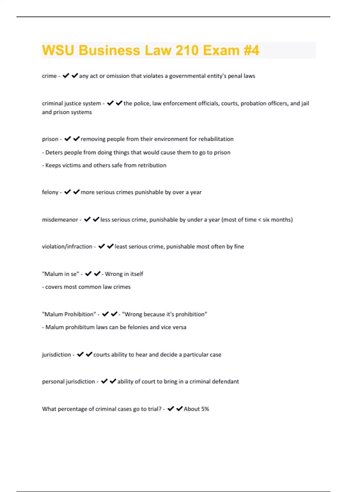 rime - any act or omission that violates a governmental entity's penal laws criminal justice system - the police, law enforcement officials, courts, probation officers, and jail and prison systems prison - removing people from their environment for rehabilitation - Deters people from doing things that would cause them to go to prison - Keeps victims and others safe from retribution felony - more serious crimes punishable by over a year misdemeanor - less serious crime, punishable by under a year (most of time < six months) violation/infraction - least serious crime, punishable most often by fine "Malum in se" - - Wrong in itself - covers most common law crimes "Malum Prohibition" - - "Wrong because it's prohibition" - Malum prohibitum laws can be felonies and vice versa jurisdiction - courts ability to hear and decide a particular case personal jurisdiction - ability of court to bring in a criminal defendant What percentage of criminal cases go to trial? - About 5%Actus Rea - The defendant committed the act Mens Rea - The defendant has a criminal intent - could be specific intent, meant to do it or - could be general intent, meant to be overall bad or reckless Strict Liability Crimes - Guilty based on Actus Rea alone 4 generally recognized levels of intent - purposely, knowingly, recklessly or negligently general intent to commit a crime... - ...includes recklessness and criminal negligence cases Criminal Burden of Proof - - Burden is on the state - Must prove "beyond a reasonable doubt" Civil Burden of Proof - - Burden is on the plaintiff - Must prove "by a preponderance of evidence" Murder: First Degree - Murder with premeditation Murder: Second Degree - Murder without premeditation Voluntary manslaughter - intentional killing in the heat of passion